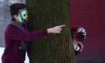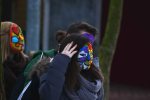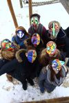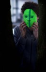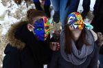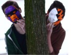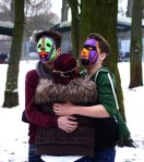 Die Masken sind zuletzt in der Klasse 9.2 entstanden. In entspannter Atmosphäre wurden Gipsbinden zu handlichen Streifen geschnitten und danach auf die säuberlich eingeschmierten Gesichter aufgetragen. Dabei ging es nicht nur um kreative Erfahrungen, sondern auch um Empathie, Vertrauen und Verantwortung. Im weiteren Verlauf entwarfen die Schülerinnen und Schüler ihre Ideen zur Gestaltung von Gut und Böse, bzw. Positiv – Negativ als Einzelansichten oder symmetrisch zweigeteilt zunächst auf dem Zeichenblock. Hier war die entsprechende Zuordnung von Formen und Farben wichtig. Weich, rund und fließend von den Formen her, sowie warm, leuchtend, angenehm und beruhigend auf der farblichen Ebene war hier das Ziel der Gestaltung für einen positiven Eindruck. Eine Mischung aggressiver Farben und Formen kennzeichnete die andere Seite. Die Aufnahmen zeigen ein improvisiertes Zusammenspiel auf dem winterlichen Schulhof.