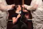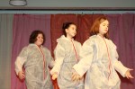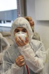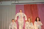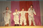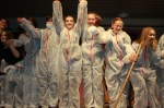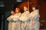 Das Forum war in bunte Farben getaucht, als die ersten menschlichen Roboter die Bühne erklimmen. In weiße Schutzanzüge gehüllt, bewegten sich die Schülerinnen und Schüler des 6ten Jahrgangs und zeigten ihren Robotertanz am laufenden Band. Anschließend stellten sie eine Situation aus dem Film „Moderne Zeiten“ von Charlie Chaplin nach, der von der monotonen Fließbandarbeit betäubt von den Rädern einer Maschine verschlungen wurde.