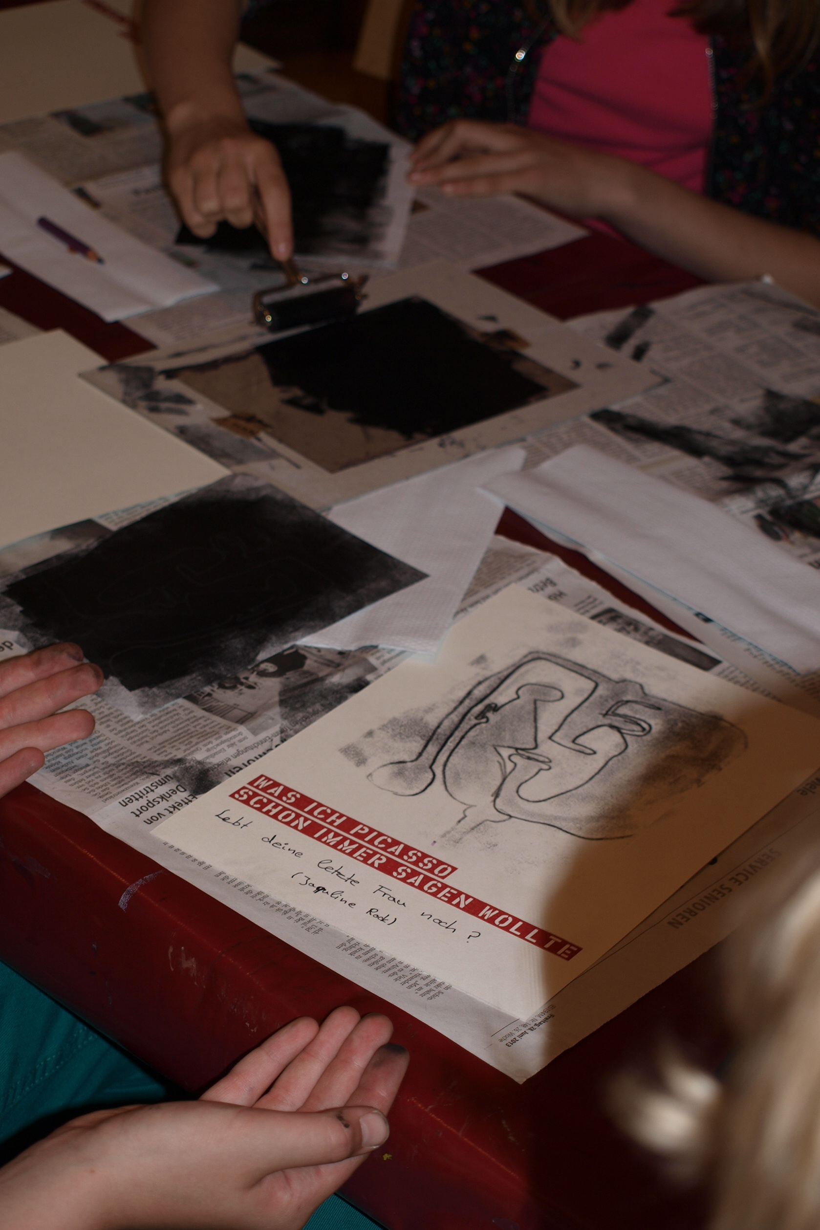 Die Kunstklasse 6.1. staunte im Picasso Museum Münster nicht schlecht über die Vielfältigkeit des Malers, denn rund 15000 Werke soll er hinterlassen haben. Sein Konterfei wurde auf dem Picassoplatz in Münster verlegt und ist bei einem Rundflug über die Stadt gut zu erkennen. Einen solchen Flug konnten sie leider nicht starten, aber einen informativen Rundgang durch die Ausstellung. Es blieben dann dort noch 5 Minuten Zeit für sie, um das für sie interessanteste Detail auf ein Blatt zu skizzieren, um es dann in der Malschule als Monotypie umzusetzen. Herzlichen Applaus gab es für die informative und kurzweilige Führung der Museumspädagogin, die die aufmerksame und kreative Gruppe lobend in den sonnigen Tag schickte.
