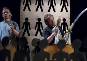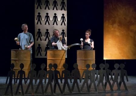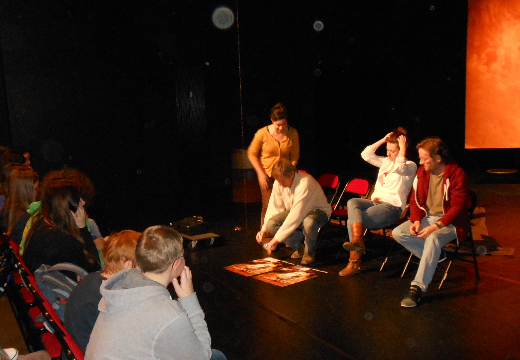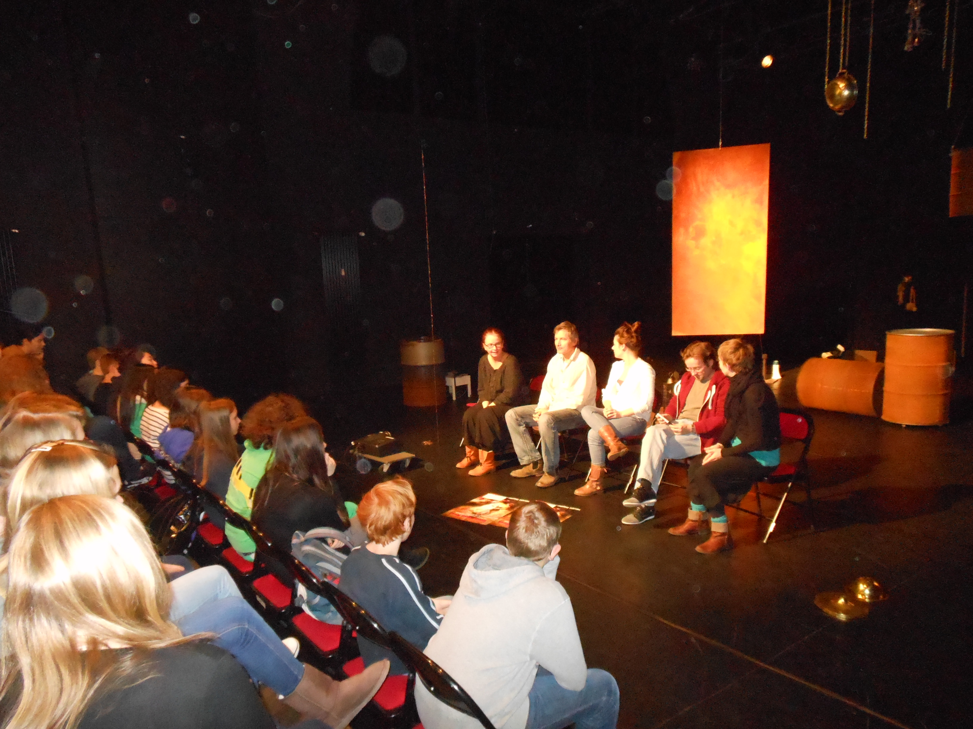Unvoreingenommen begaben sich an einem windigen, stürmischen Vormittag 60 Schülerinnen und Schüler des Fachs Darstellen und Gestalten auf den Weg nach Hamm. Gleich neben dem Bahnhof gibt es kleines Theater, das Helios Theater, das für Kinder und Jugendliche Stücke produziert. Glanz und Rost heißt das Stück, das irgendwie gar kein richtiges Stück ist, wie man es so kennt. Als erfahrene DG-Schüler konnten sich dann doch Viele aus der angebotenen Klangvielfalt, den Satzfragmenten, den ungewohnten Bildangeboten und Schattenspielen eine Geschichte zusammenreimen. Eine Zeitreise wurde ihnen angeboten, die das Thema Metall in den Blick nimmt und wie der Mensch im Laufe der Zeit Metall für sein Leben benutzt. „Ja, selbst in euren Handys ist Metall, sogar ein ganz seltenes, das zur Zeit hoch gehandelt wird“, stellte einer der Schauspieler fest. Gemeinsam mit ihm, der Regisseurin, dem Musiker und seiner Kollegin fand eine intensive Nachbesprechung statt. Im Kulturrucksack nahmen sie dann mit Autogrammen signierte Plakate für die Klassenzimmer mit. „Gerne dürft ihr wiederkommen und vielleicht seid ihr in 2015 bei Tusch dabei, einem Projekt bei dem Theater und Schule zusammen arbeiten“, meinte die verantwortliche Theaterpädagogin Frau Kölling.