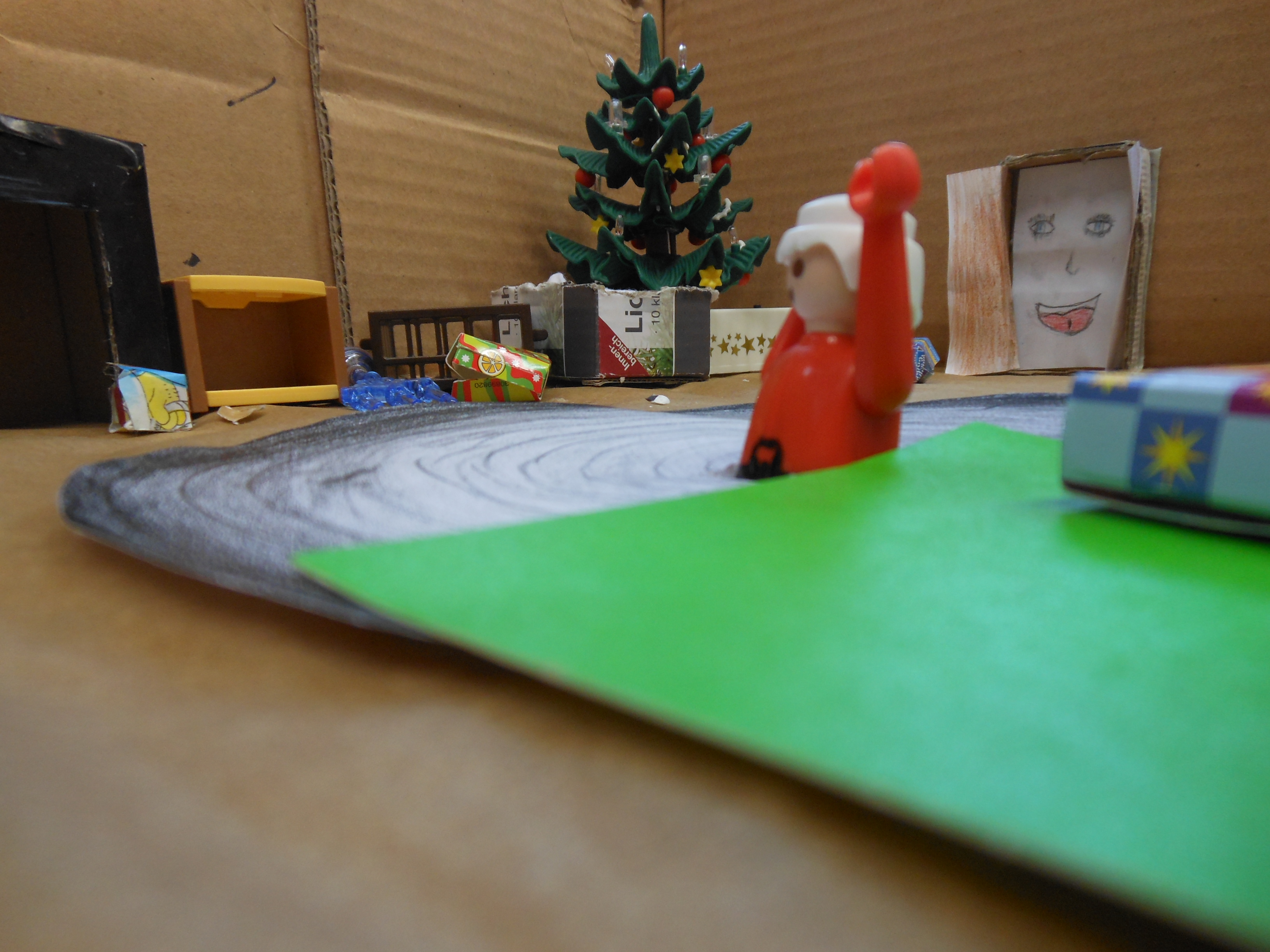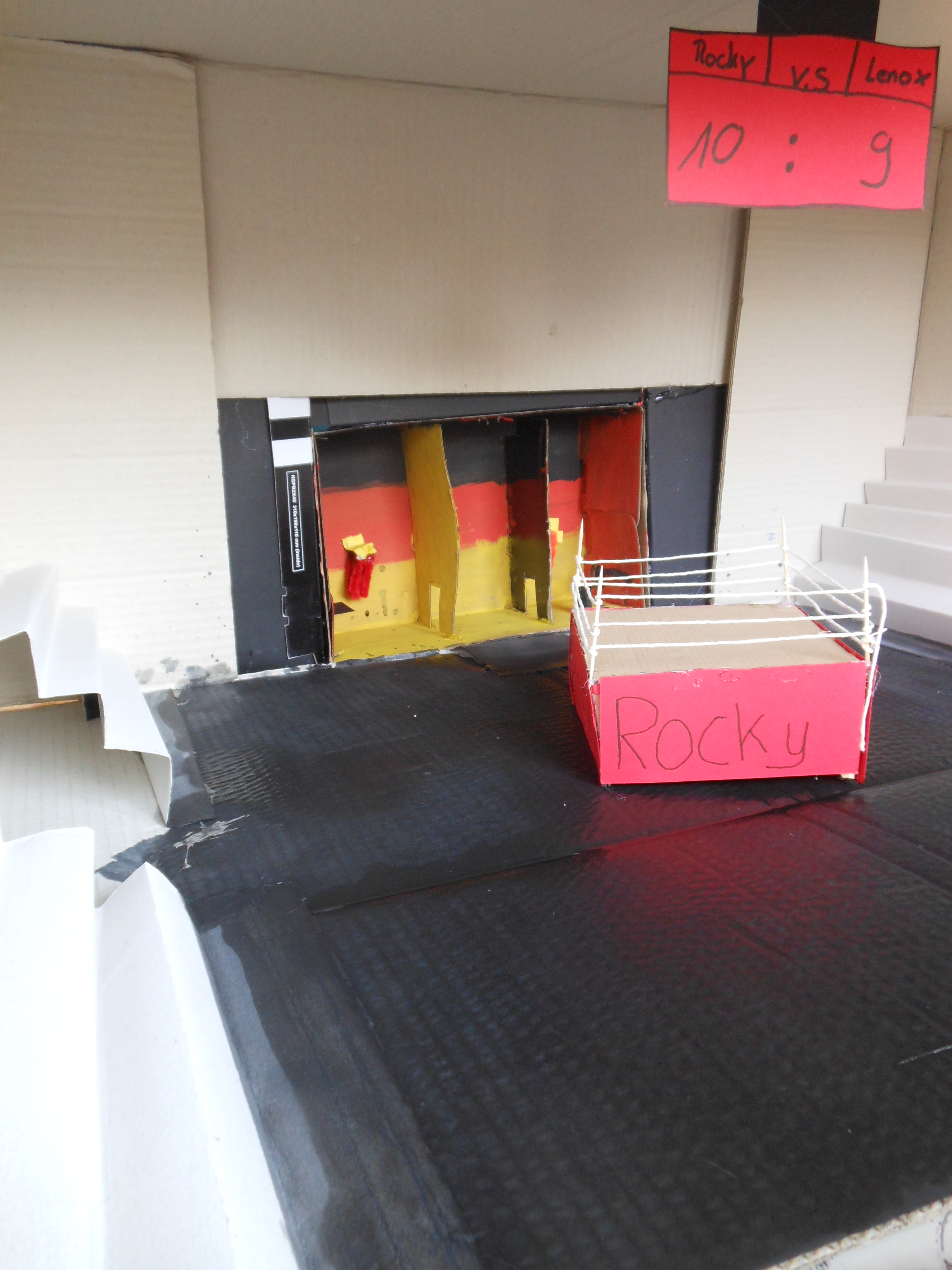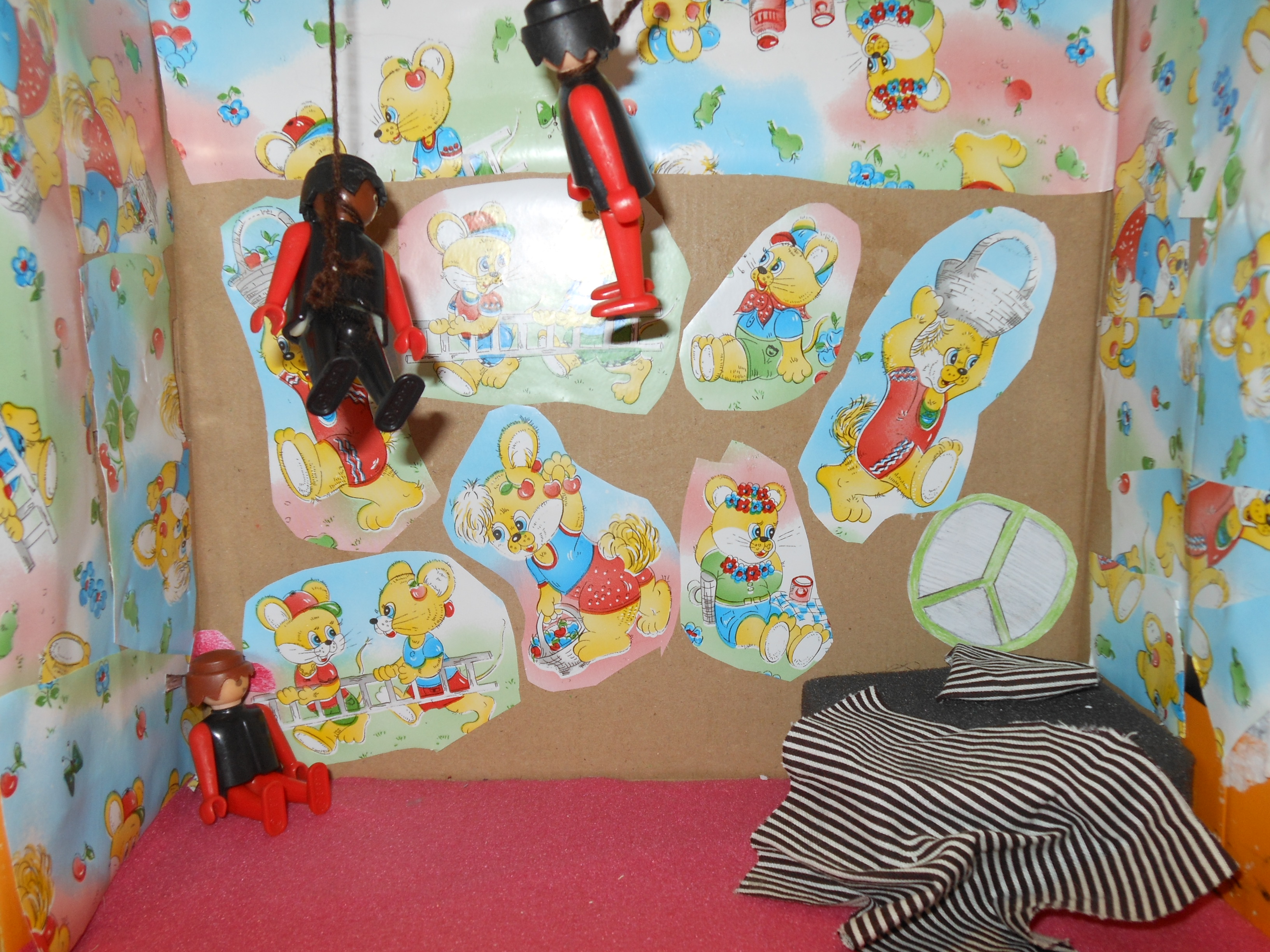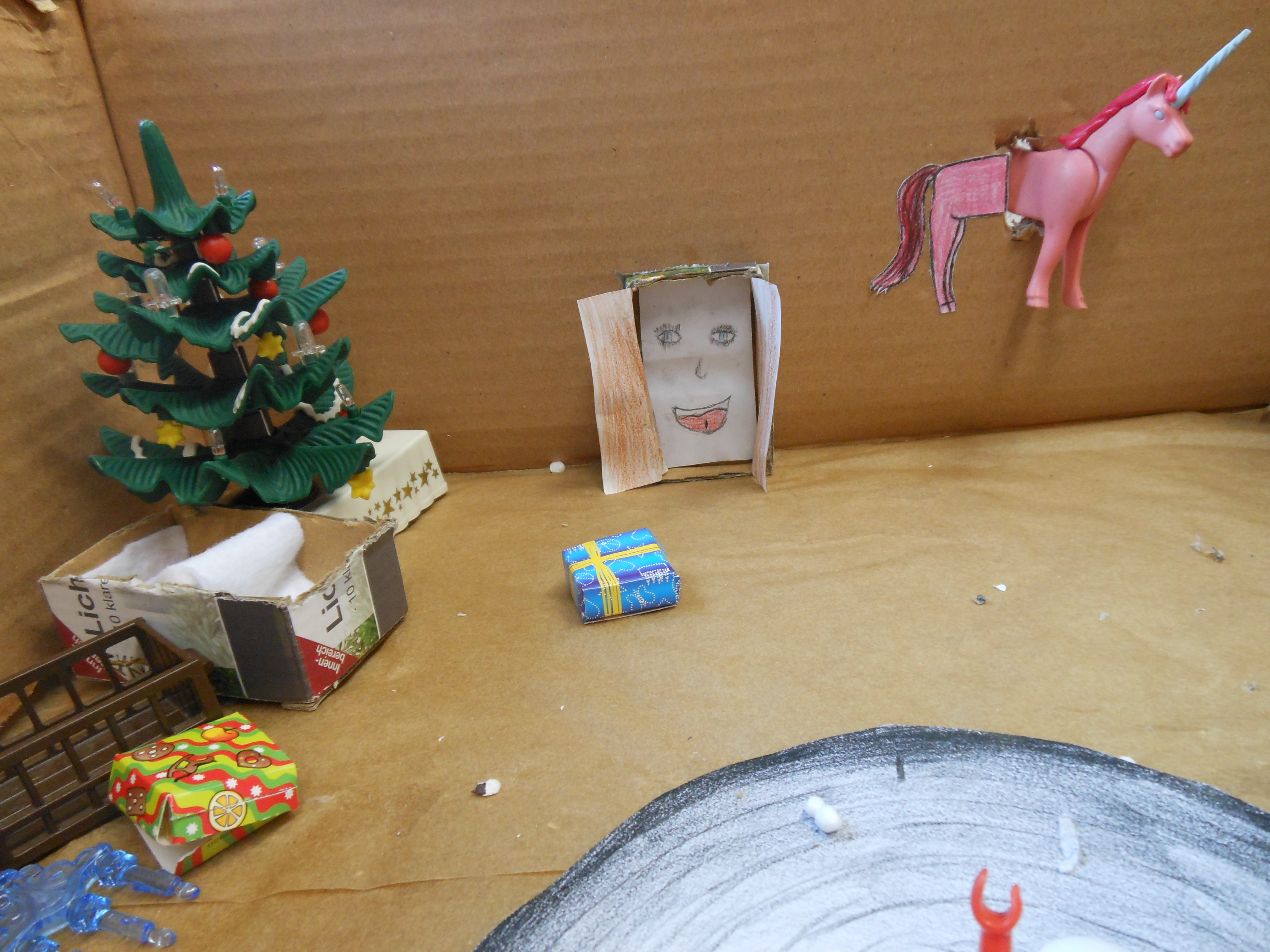 Ein Krokodil taucht in blau gefärbt aus einer mit gleicher Farbe gefüllten Tonne auf. Eine eigens im Raum gespannte Folie ist von Farbflecken übersät. Ein Mann steht an der Seite und drückt einen Knopf. Das wie im Theater beleuchtete Szenario in einem Diorama „Krokodilfärberei“ des Künstlers Peter Basseler war Ausgangspunkt für die gestalterische Arbeit der Schülerinnen und Schüler des 7ten Jahrgangs. Die „Dioramen sind moderne Märchen aus einer zwischen Realität und Fiktion schwebenden Welt, jenseits aller Orte, Zeiten und Normen.“ Fiktionsräume zu planen und umzusetzen, damit beschäftigten sich die Schüler und Schülerinnen der Klasse 7.3. und 7.4.