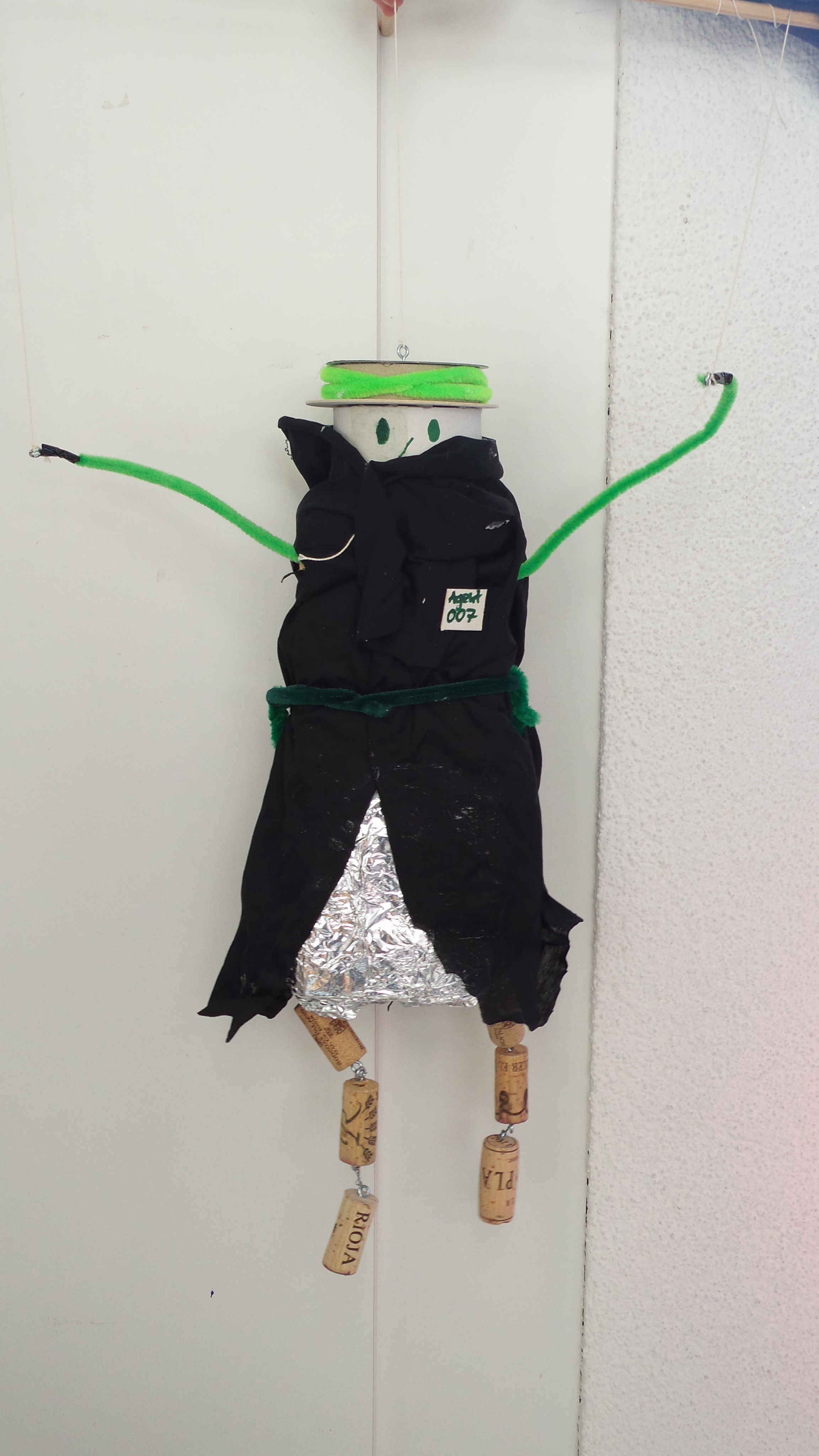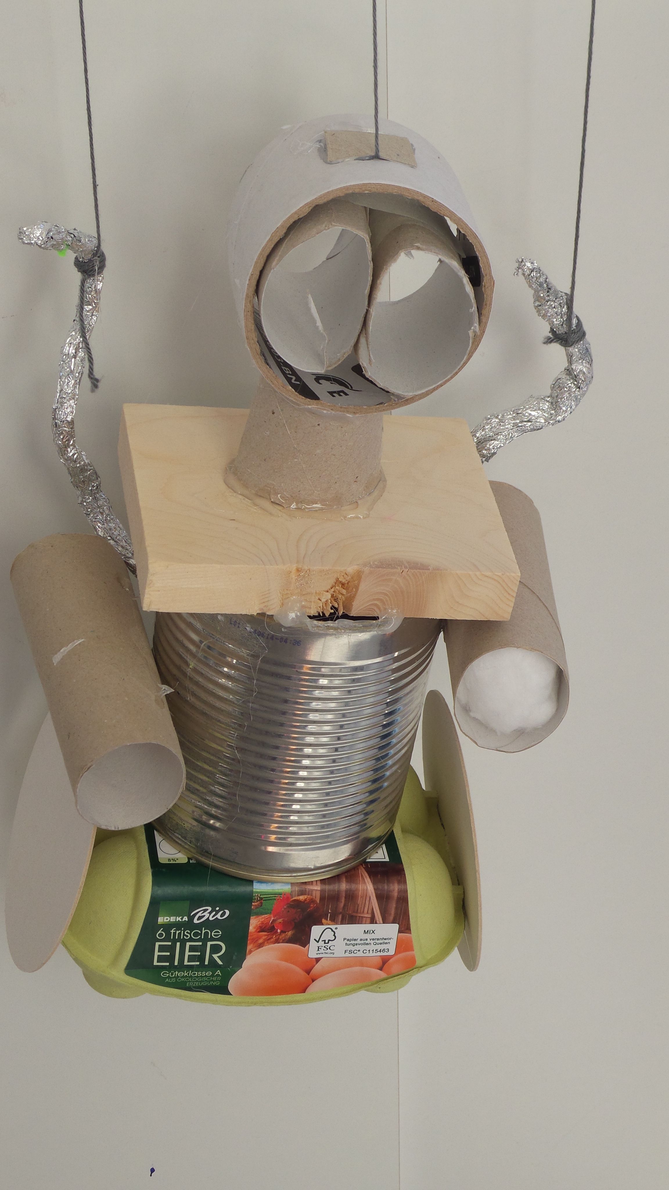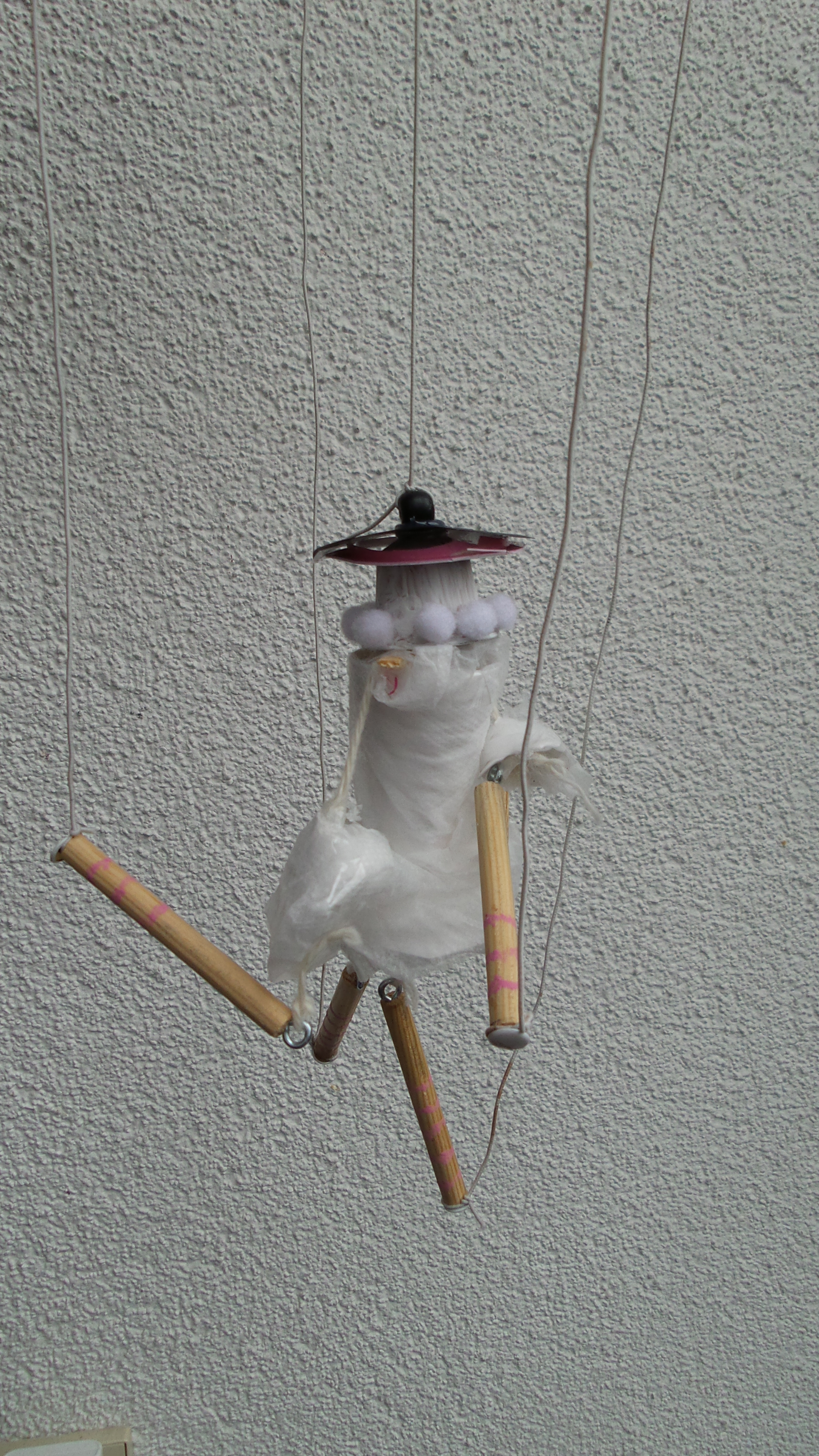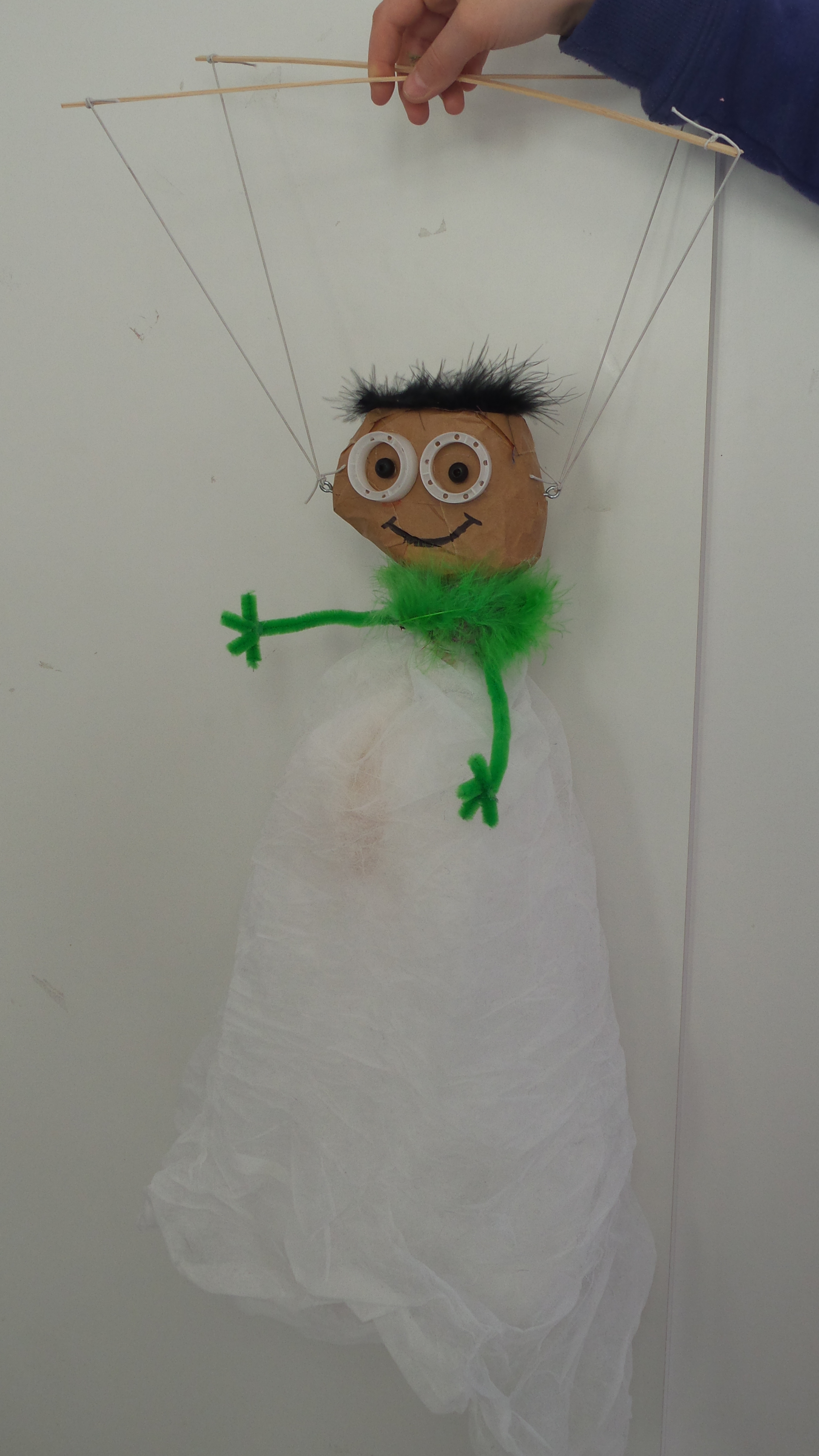 In der Malschule der Bielefelder Kunsthalle standen unzählige Materialien bereit und schnell waren erste Ideen für eine eigene Marionette entwickelt. Die Zeit verging wie im Flug und bevor es hieß, wir müssen gleich zum Zug, wurden die Marionetten an die Spielkreuze befestigt und konnten erste Geh-, Flug- und Tanzschritte wagen.