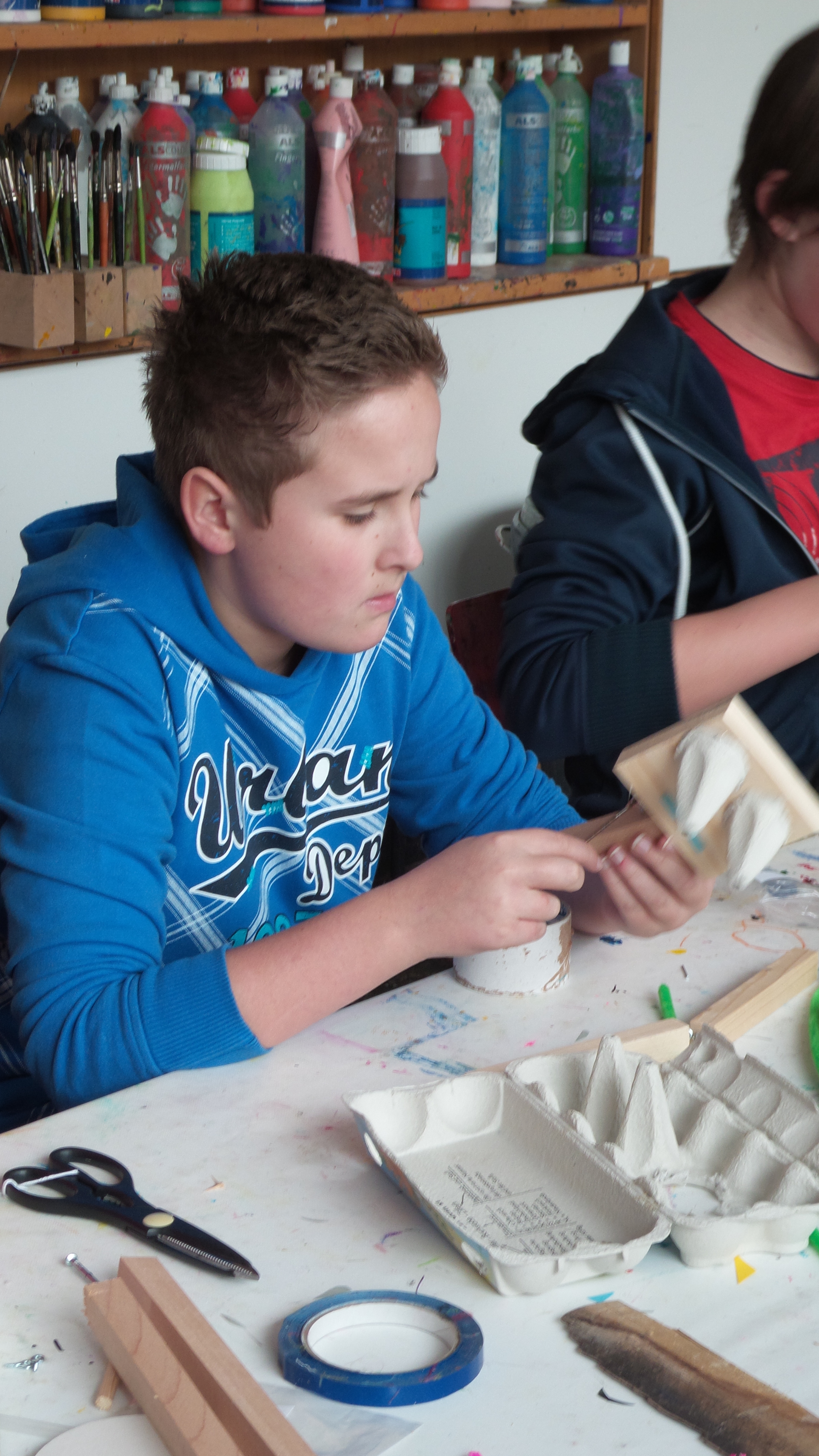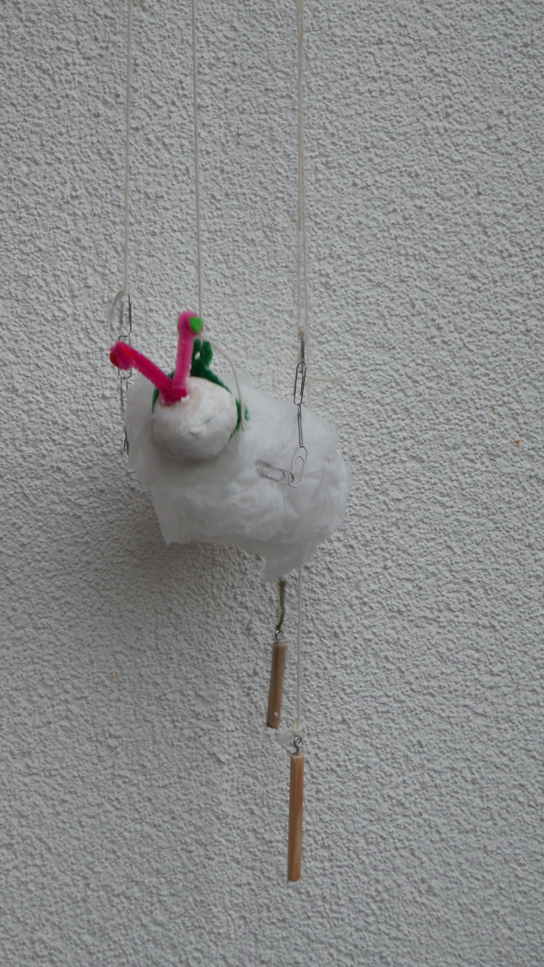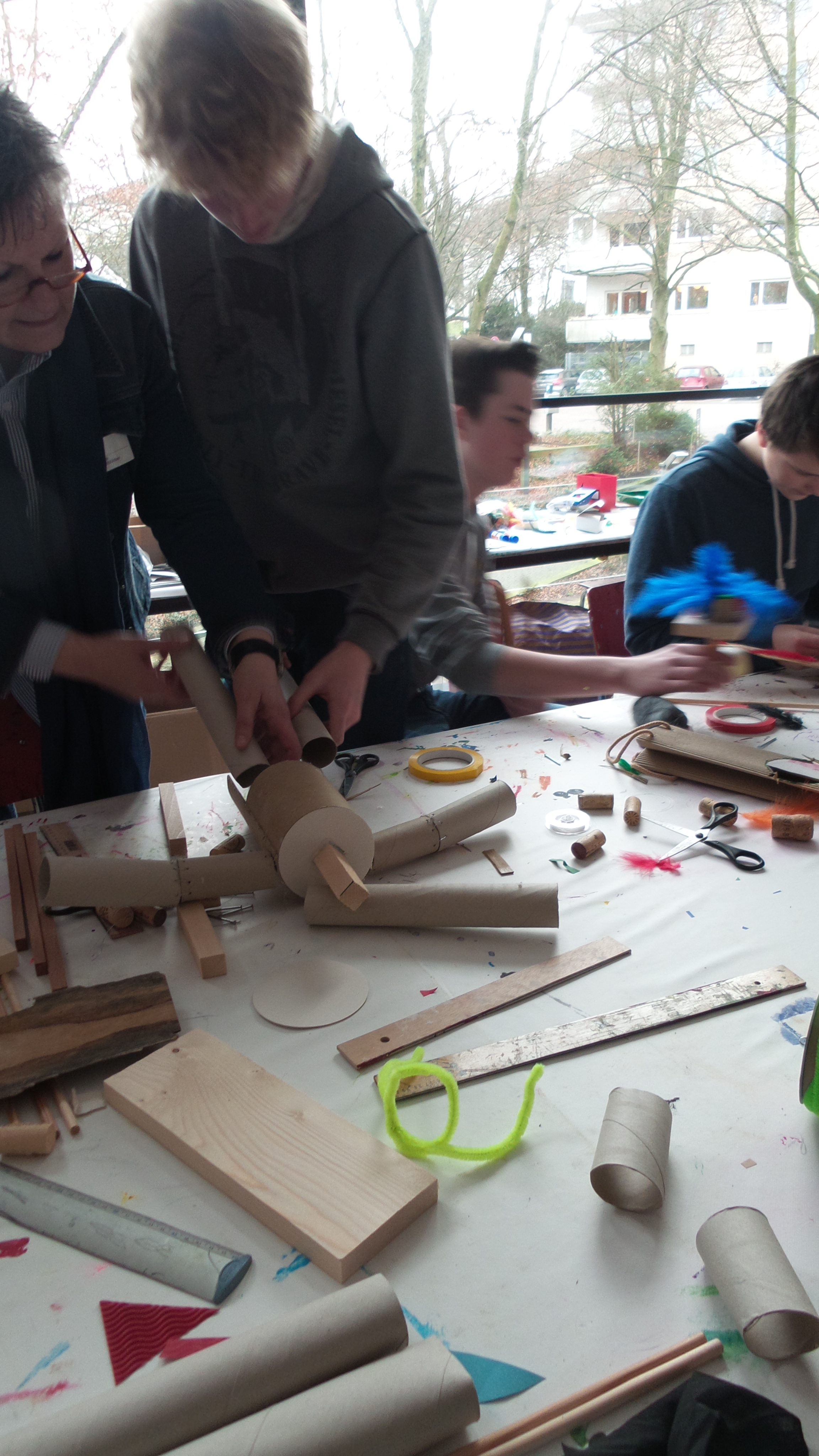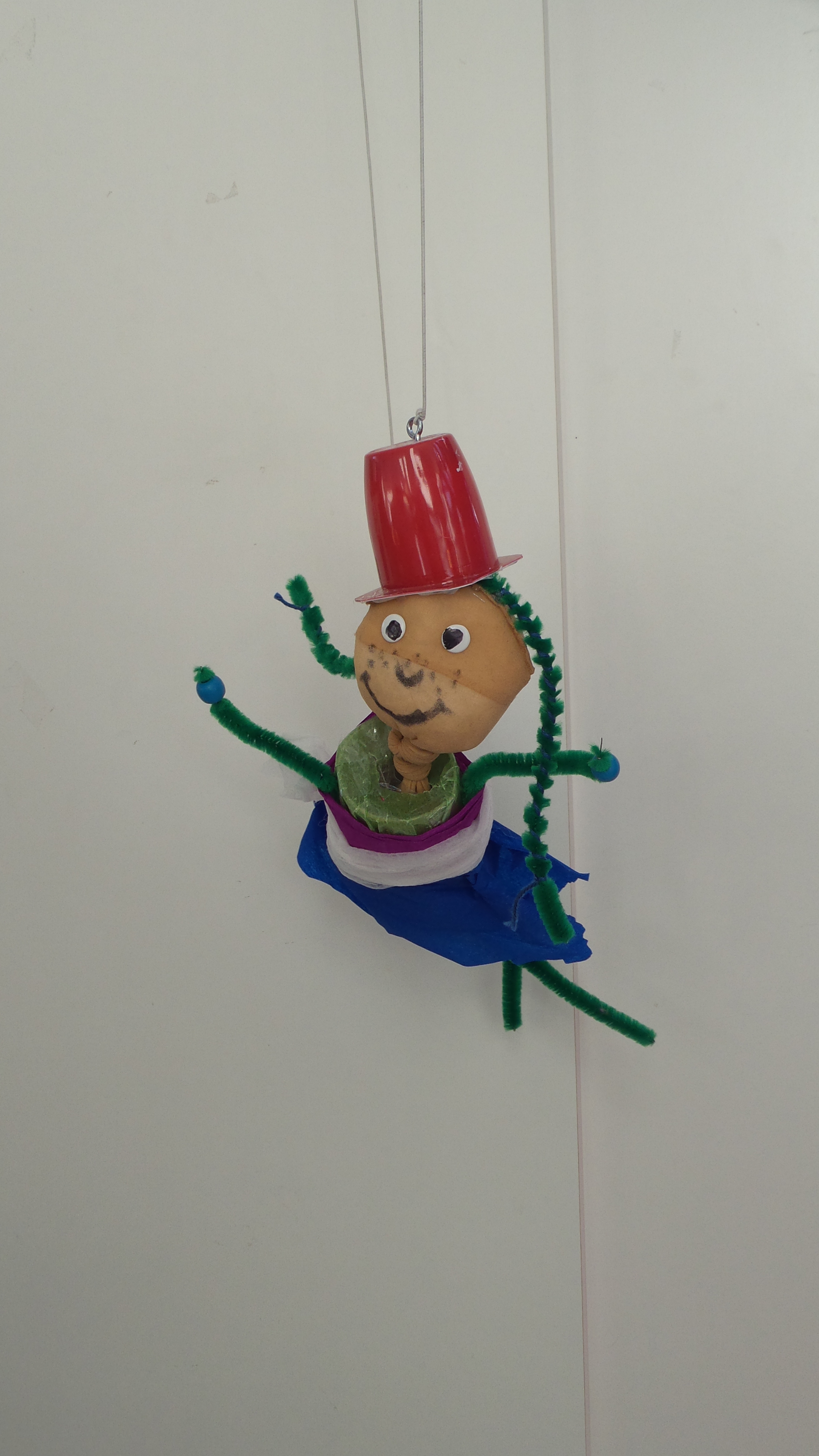 In der Malschule der Bielefelder Kunsthalle standen unzählige Materialien bereit und schnell waren erste Ideen für eine eigene Marionette entwickelt. Die Zeit verging wie im Flug und bevor es hieß, wir müssen gleich zum Zug, wurden die Marionetten an die Spielkreuze befestigt und konnten erste Geh-, Flug- und Tanzschritte wagen.