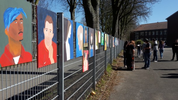 Als Abschluss ihrer Reihe zum Thema „Nähe und Distanz“ realisierten die Schülerinnen und Schüler des 12er Kunst-LK eine spontane Ausstellung unter freiem Himmel. Ein guter Anlass für anregende Diskussionen bei strahlend blauem Himmel.