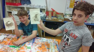 In der Ausstellung „I am a chair.Sammlung Werner Löffler.Stühle im Dialog“ die vom 18.2.2018 bis 1.5.2018 dauern wird, begegneten ihnen die unterschiedlichsten Stühle aus vielen Generationen. Faszinierend entdeckten sie die Motiv- und Formenvielfalt der gestalteten Objekte. In der Malschule übertrugen sie die von ihnen genau betrachteten Motive und Formen in eine Skizze. Ein neues Stuhlobjekt entwickelte sich und wurde auf eine Druckplatte übertragen. Mit viel Spaß und gemeinsamer Hilfestellung entstanden kleine Druckgrafiken.