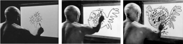 Eine kurze Filmsequenz aus dem Jahr 1956 zeigt den Spanier Pablo Picasso bei der Arbeit: Mit lockerem Strich malt der Künstler eine Blumenvase. Doch dabei soll es nicht bleiben …