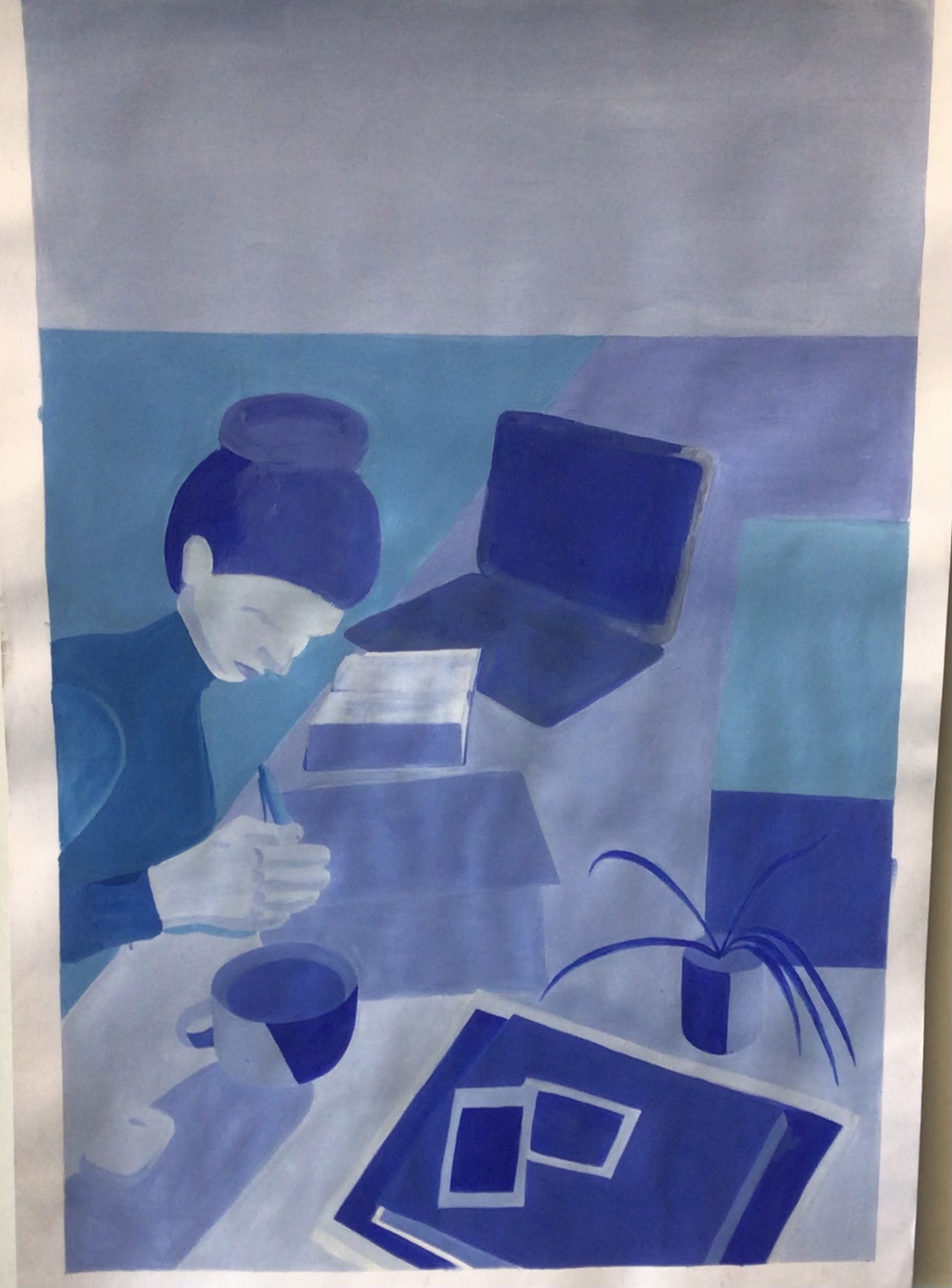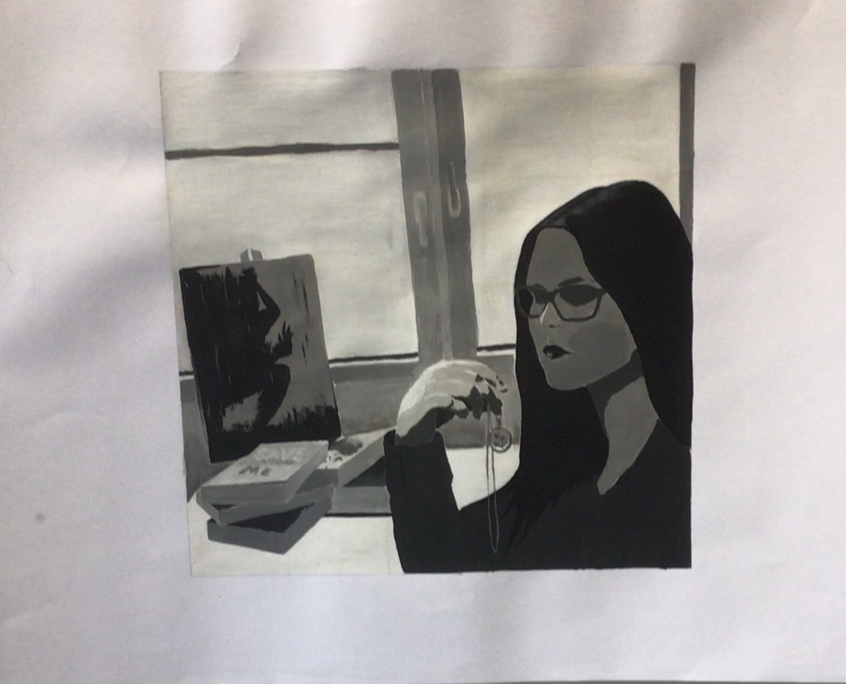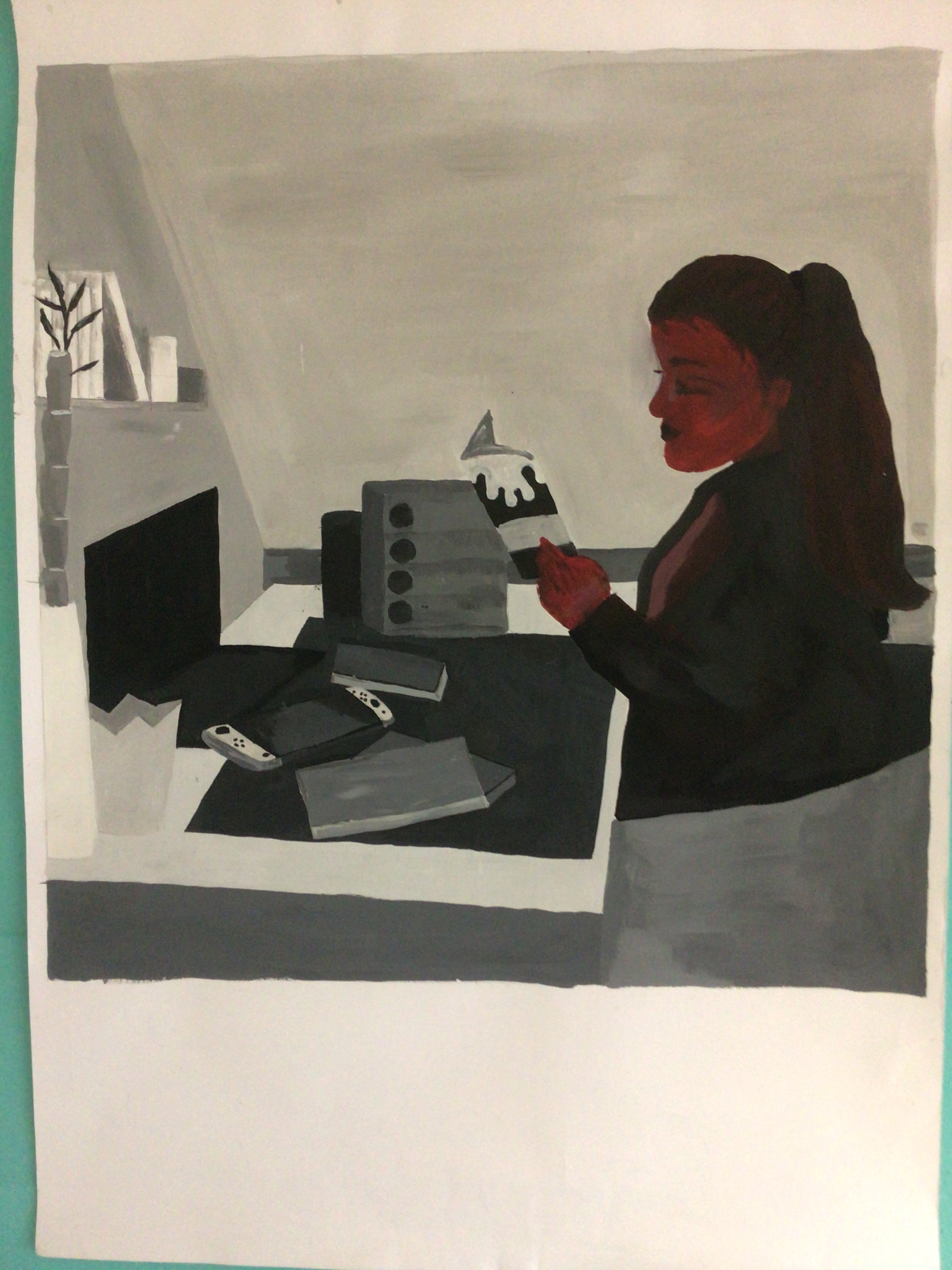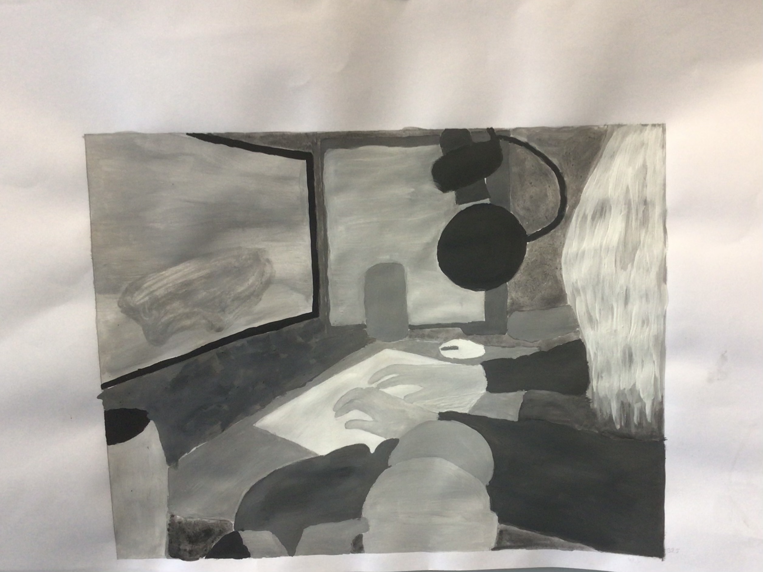 Dazu startete die künstlerische Aufgabe der Kunstklasse des neunten Jahrgangs damit, ein Foto zu erstellen. Auf dem Foto sollte der Schüler bzw. die Schülerin, der bzw. die das Foto erstellte, der eigene Arbeitsplatz und relevante Gegenstände, die während der Ausgangssperre eine wichtige Bedeutung hatten, zu erkennen sein. Des Weiteren sollte das Foto das Arbeiten während dieser Zeit widerspiegeln. Nach den Sommerferien wurde dann an die Fotos angeknüpft, indem sie bearbeitet wurden, um sie zu vereinfachen. Nun folgten der künstlerische Teil und der Grund, warum die Fotos bearbeitet wurden. Die Fotos sollten originalgetreu und maßstabsgerecht mit Acrylfarbe auf Karton übertragen werden. Zum originalgetreuen und maßstabsgerechten Übertragen diente das neu erlernte Rasterverfahren, das bereits von alten Meistern verwendet wurde.