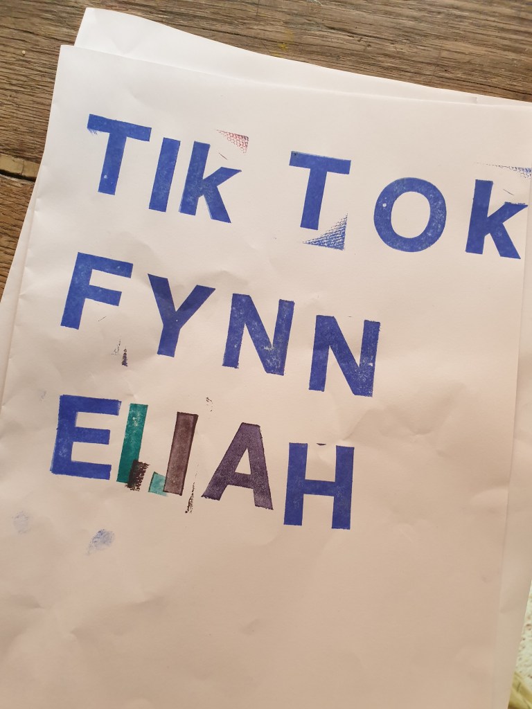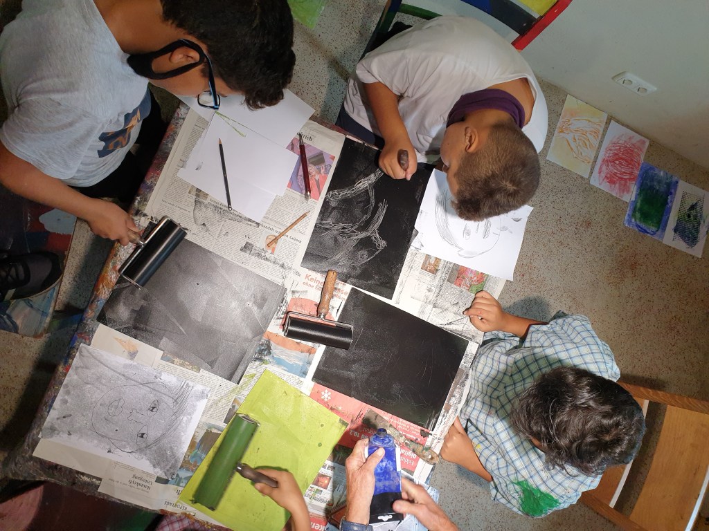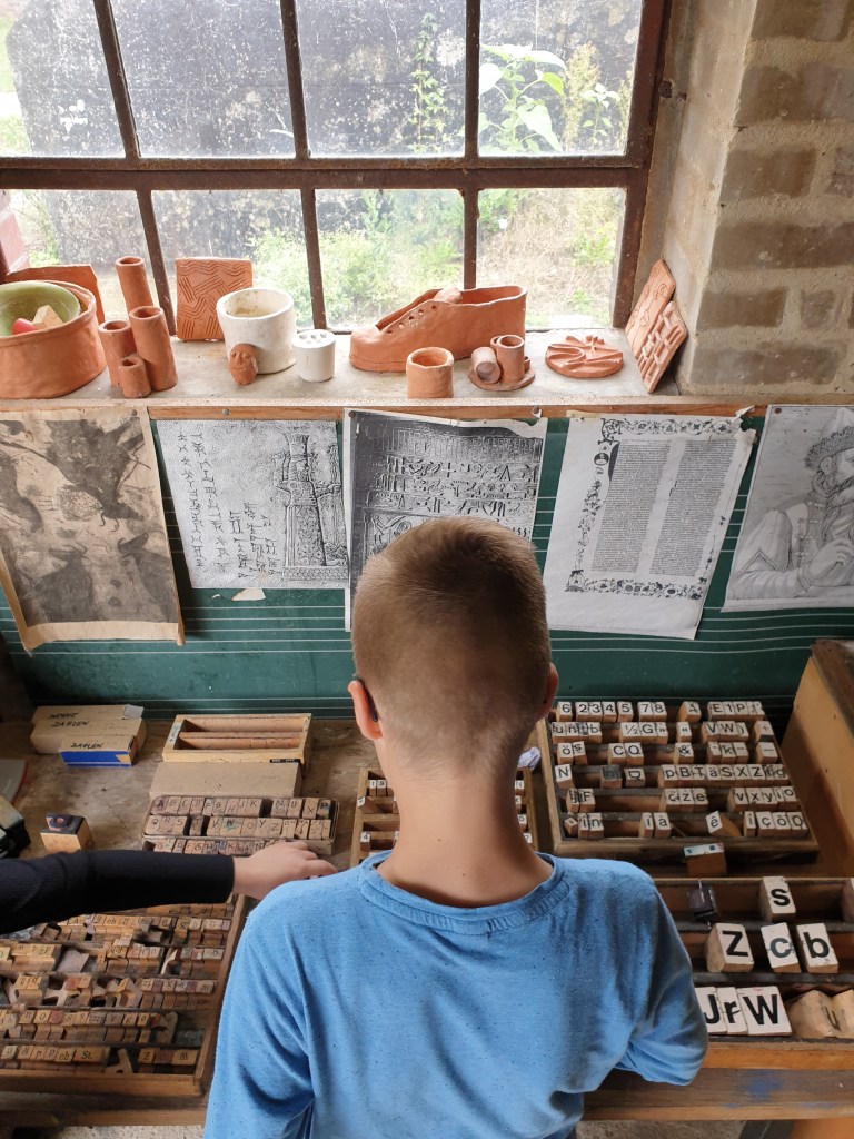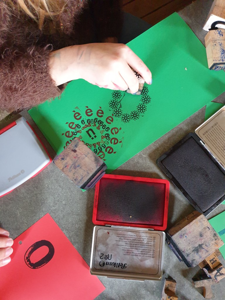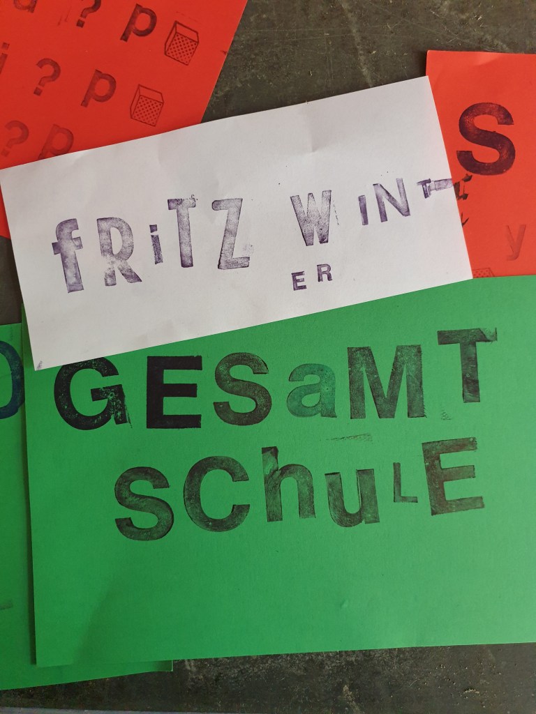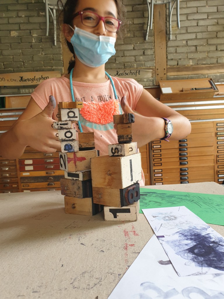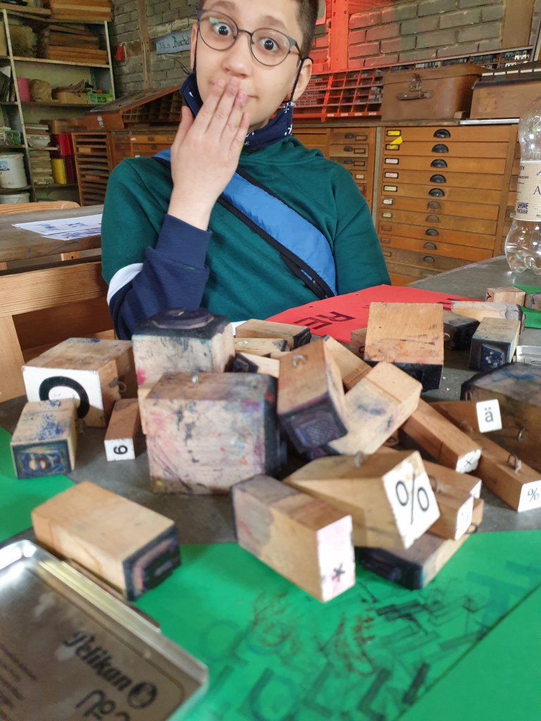 Ein riesiger Fundus mit verschiedenen Buchstaben-Stempeln stand uns für unsere Schrift-Experimente in der Druckwerkstatt zur Verfügung. Aber auch das Zeichnen und Abdrücken von Formen und Gegenständen mithilfe eingefärbter Rollen und Acryl-Platten hat großen Spaß gemacht.