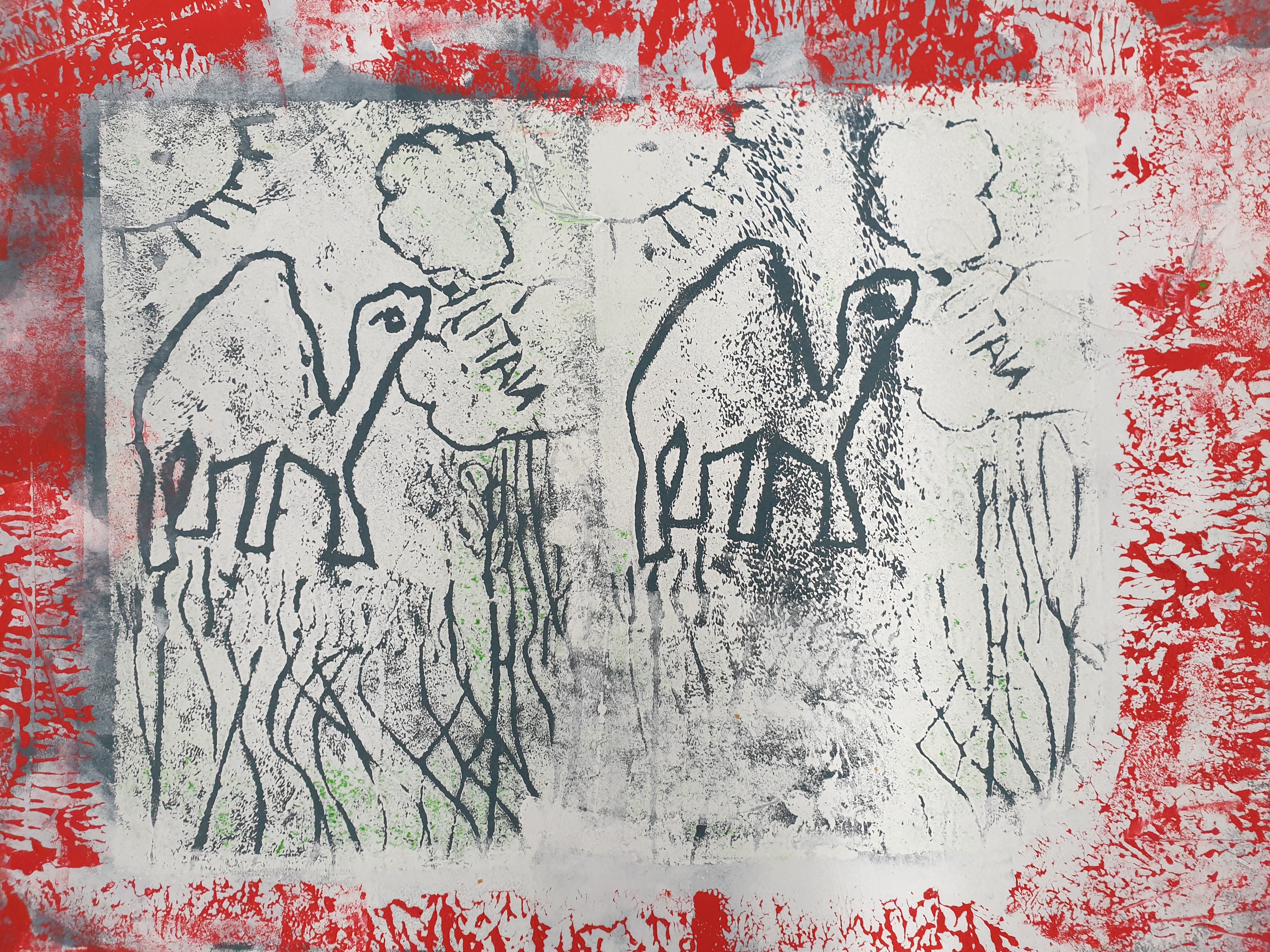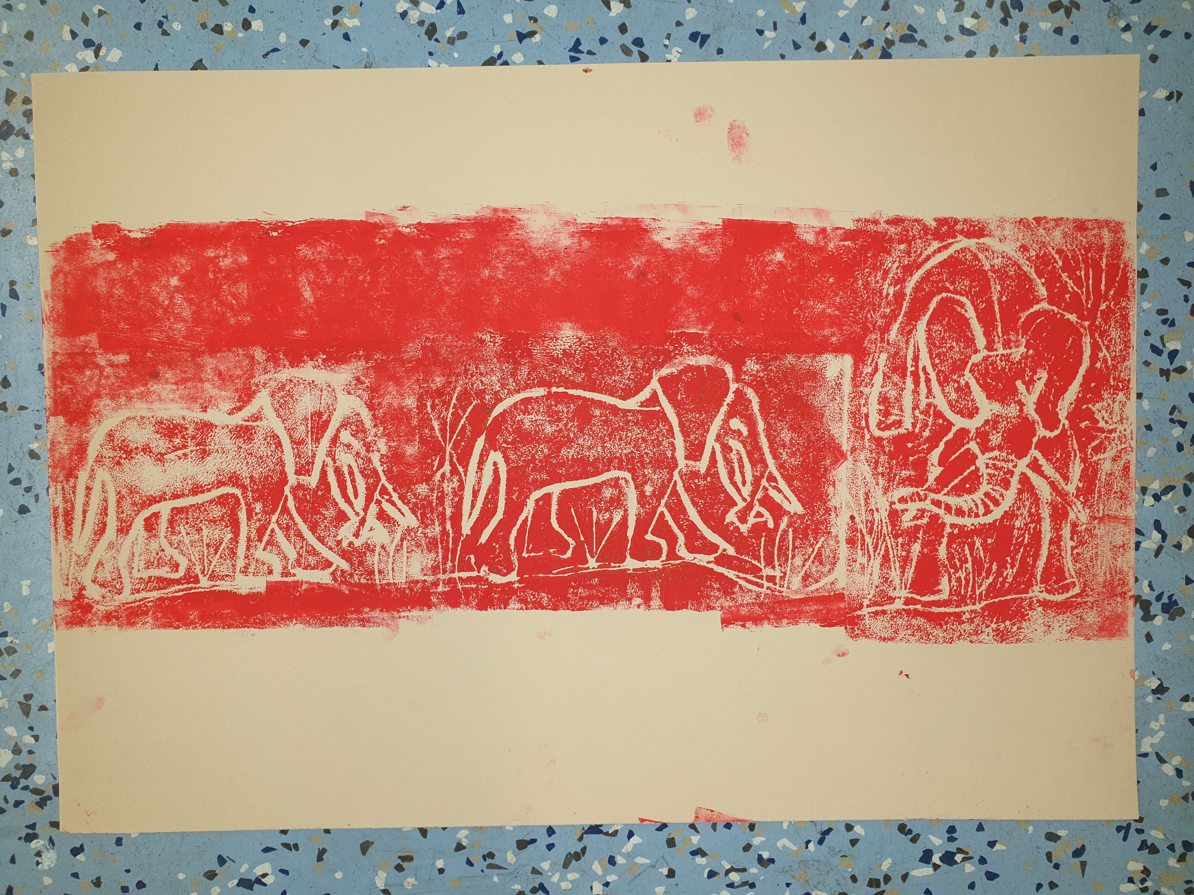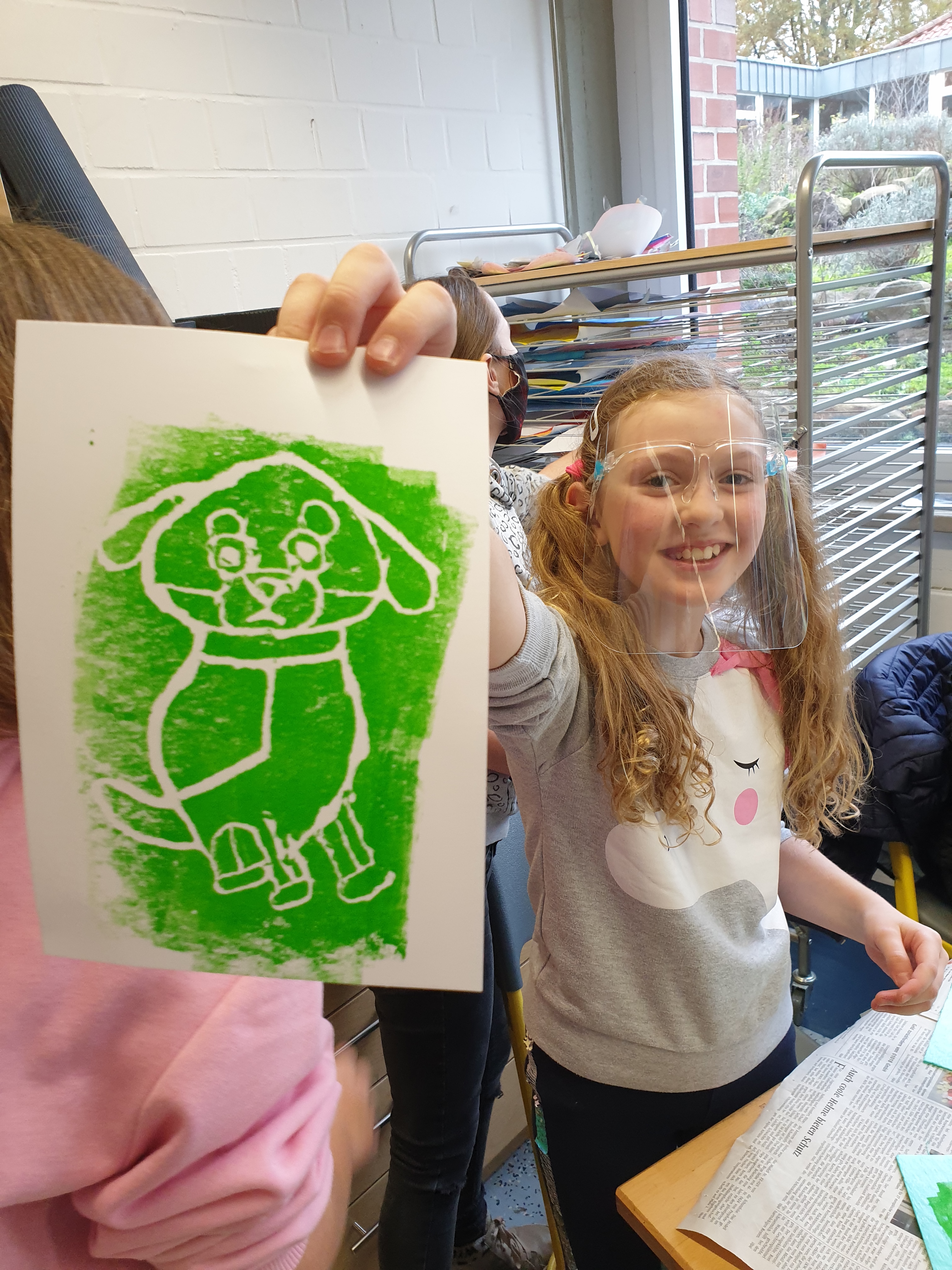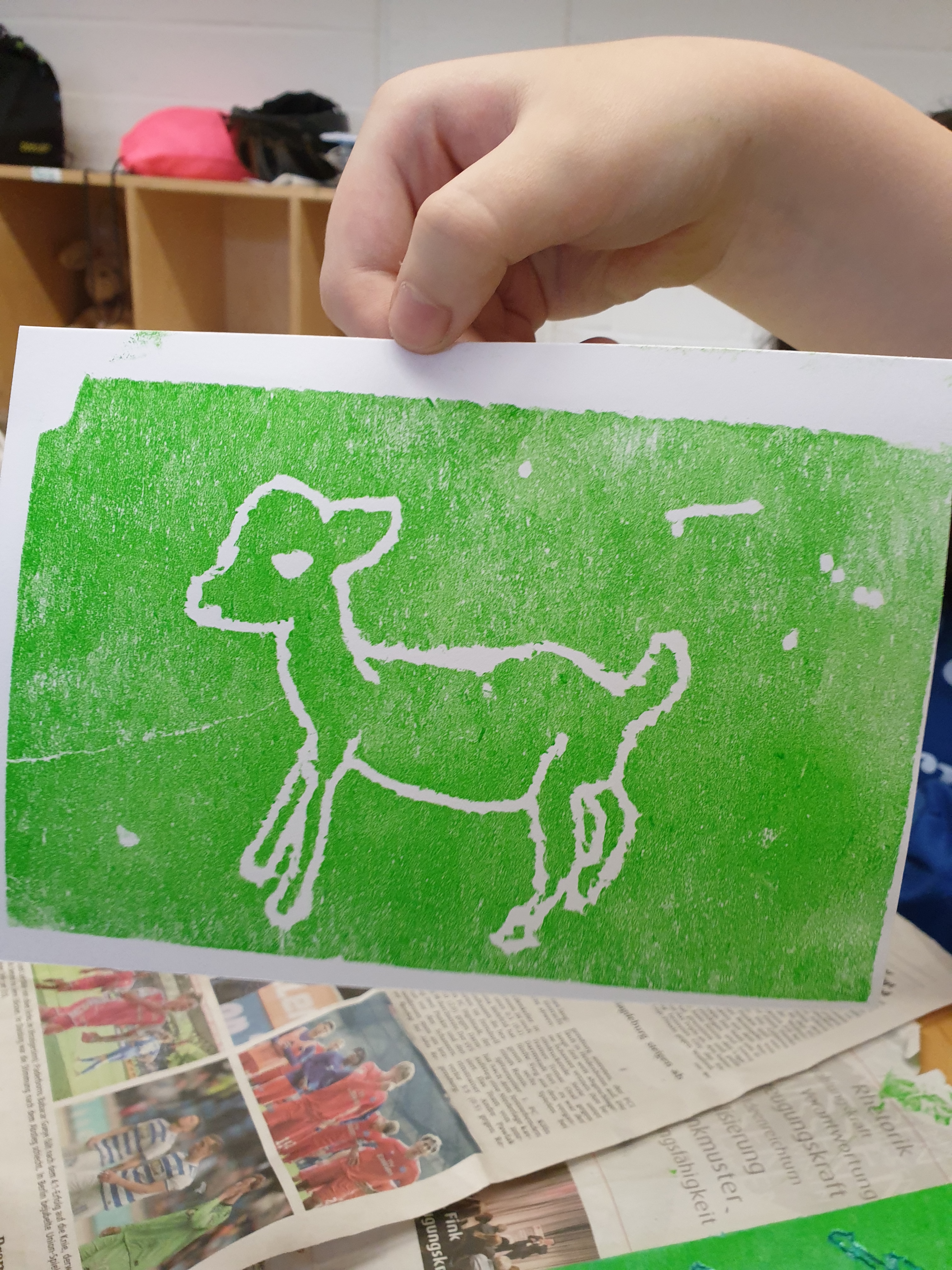 Alle hatten hierzu ihre eigene Tierfigur von zu Hause mitgebracht. Die Figuren wurden dann aus verschiedenen Ansichten gezeichnet und die Zeichnungen später auf Druckplatten übertragen. Mit dem Drucken kannten wir uns seit unserem Besuch bei Künstler Jürgen Krass ja schon ein wenig aus. Das Zeichnen der Tiere war eine neue Herausforderung, die ungeahnte Talente zum Vorschein brachte.