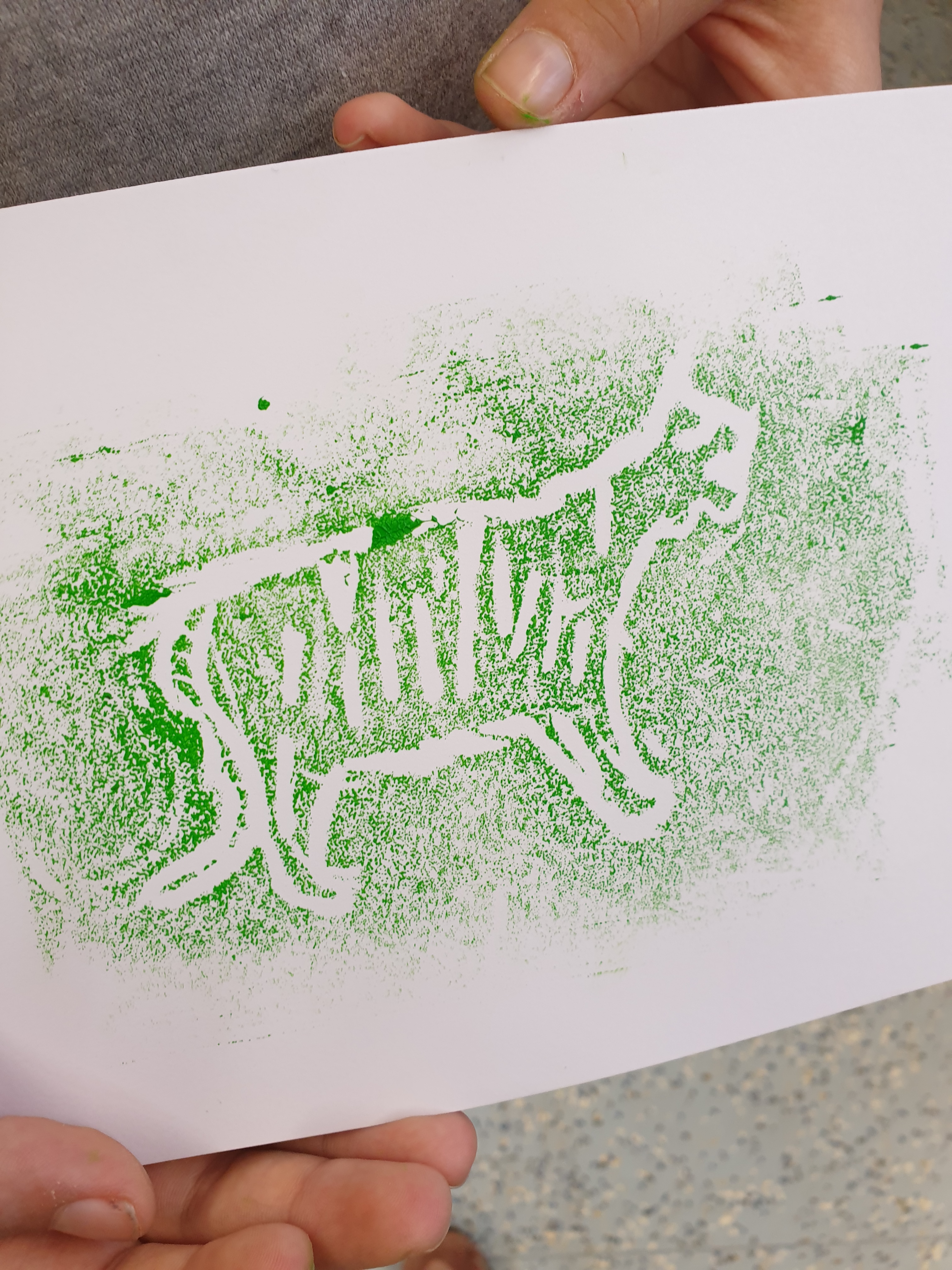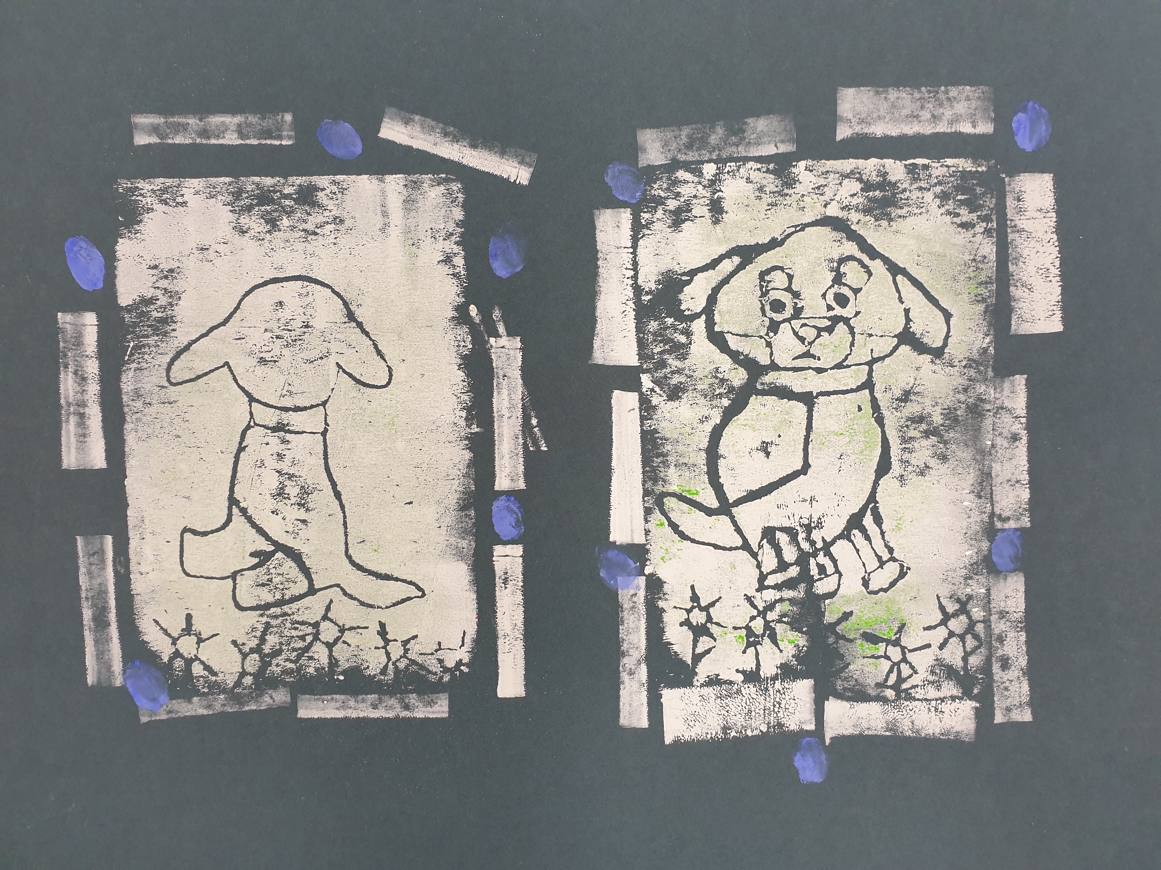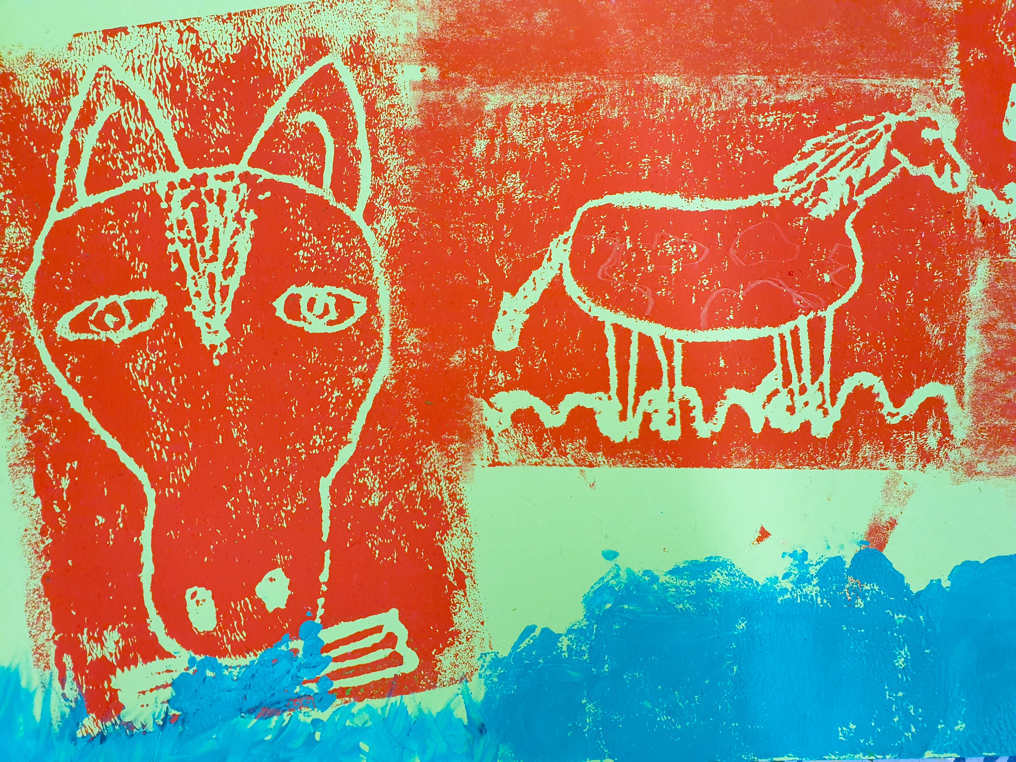 Alle hatten hierzu ihre eigene Tierfigur von zu Hause mitgebracht. Die Figuren wurden dann aus verschiedenen Ansichten gezeichnet und die Zeichnungen später auf Druckplatten übertragen. Mit dem Drucken kannten wir uns seit unserem Besuch bei Künstler Jürgen Krass ja schon ein wenig aus. Das Zeichnen der Tiere war eine neue Herausforderung, die ungeahnte Talente zum Vorschein brachte.