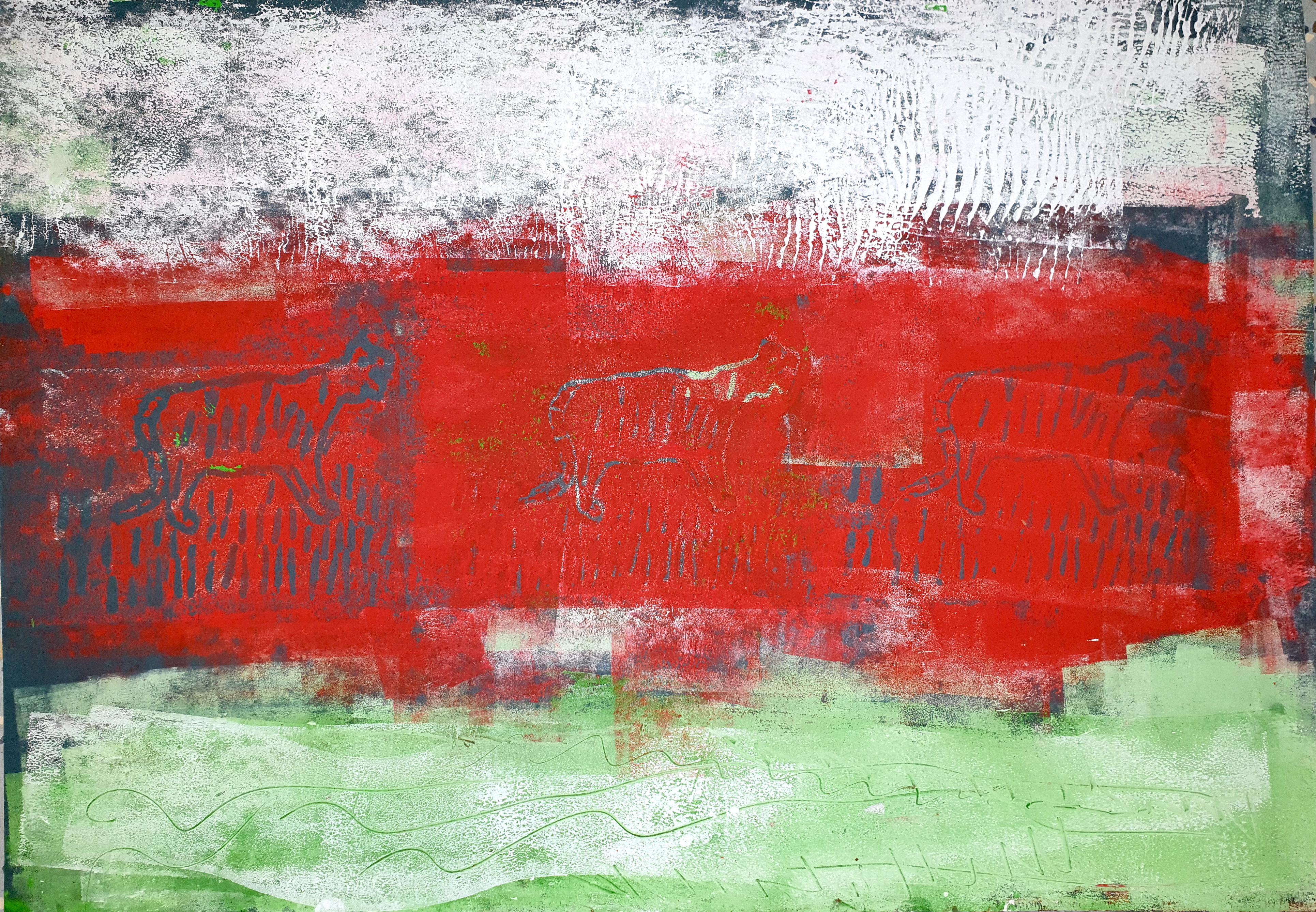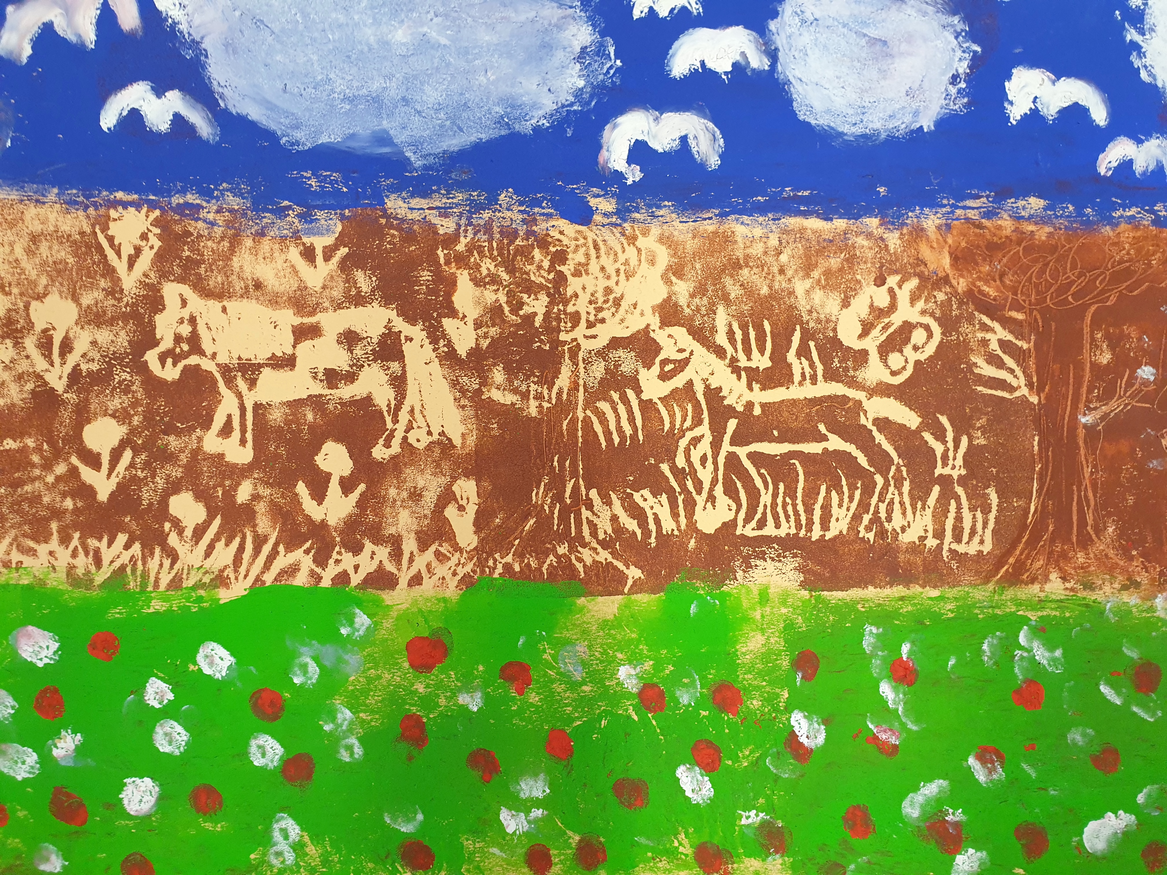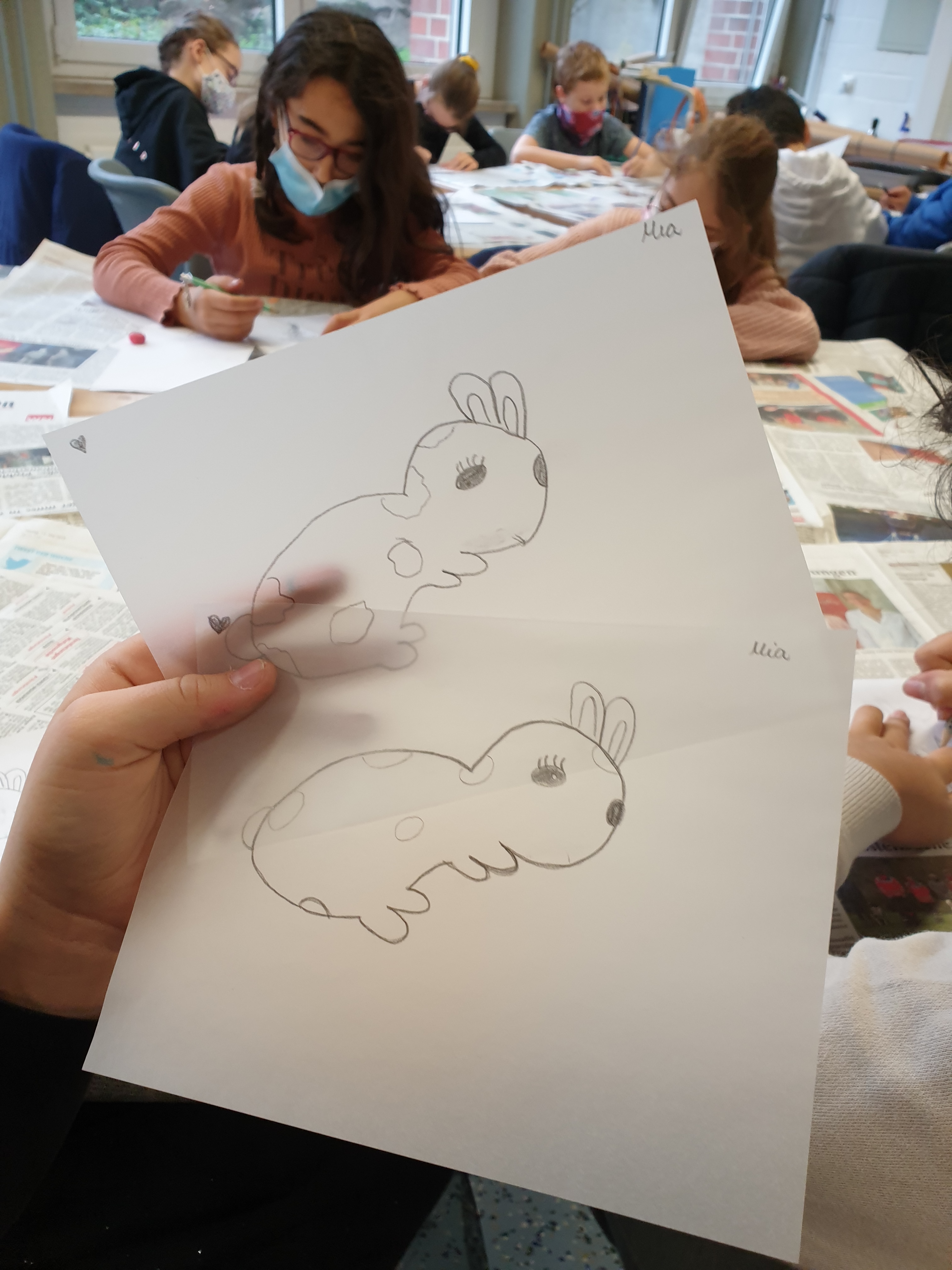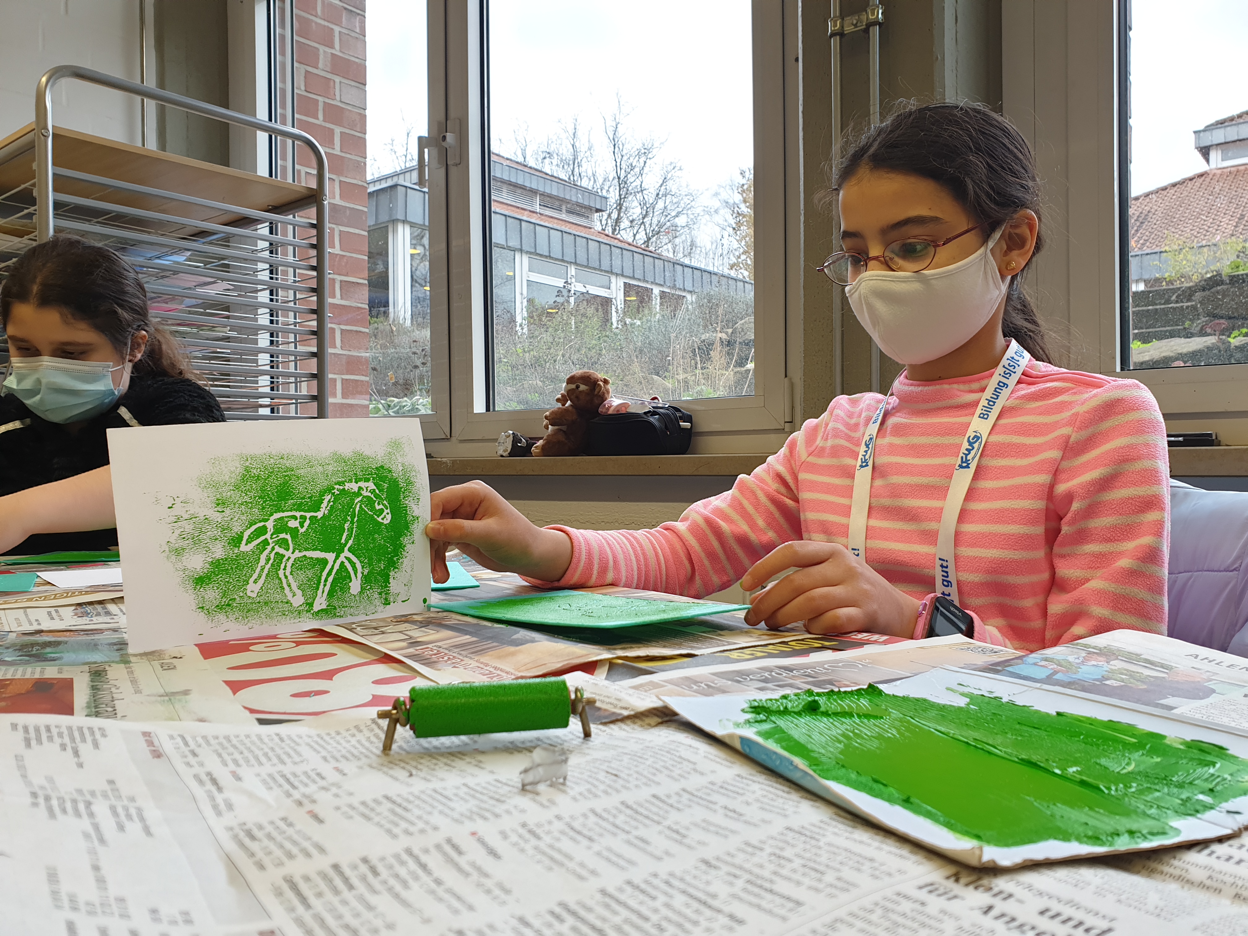 Alle hatten hierzu ihre eigene Tierfigur von zu Hause mitgebracht. Die Figuren wurden dann aus verschiedenen Ansichten gezeichnet und die Zeichnungen später auf Druckplatten übertragen. Mit dem Drucken kannten wir uns seit unserem Besuch bei Künstler Jürgen Krass ja schon ein wenig aus. Das Zeichnen der Tiere war eine neue Herausforderung, die ungeahnte Talente zum Vorschein brachte.